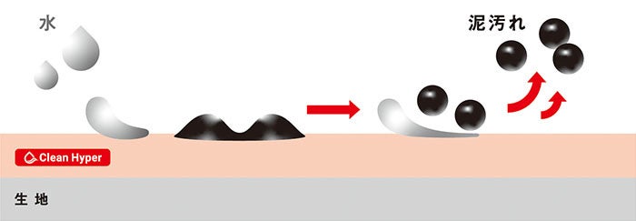 『Pure Hyper』は薬剤メーカーと共同開発したオリジナル防汚剤※3を繊維に加工し、生地の親水性を向上させています。水が生地と泥の隙間に入りこみ泥汚れを浮かせるため、こすり洗いなしでも泥汚れを落としやすくしています。