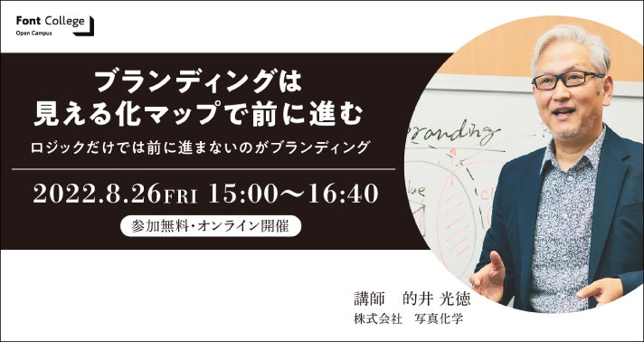株式会社モリサワは、2022年8月26日(金)にFont College Open Campus 2限目「『ブランディングは見える化マップで前に進む』 ~ロジックだけでは前に進まないのがブランディング~」をオンラインセミナーにて開催します。