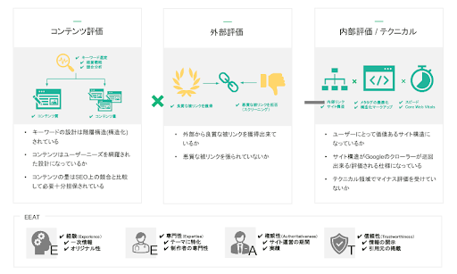 Googleが検索順位の決定に使用しているアルゴリズムは200以上あると言われていますが、WACULとしてはコンテンツ評価/外部評価/内部評価/EEATをGoogleが総合的に判断し、その合計点が高いページが上位に表示されると考えています。つまり、安定して成果を得るには、それら全てを高いレベルで維持していく必要があります。