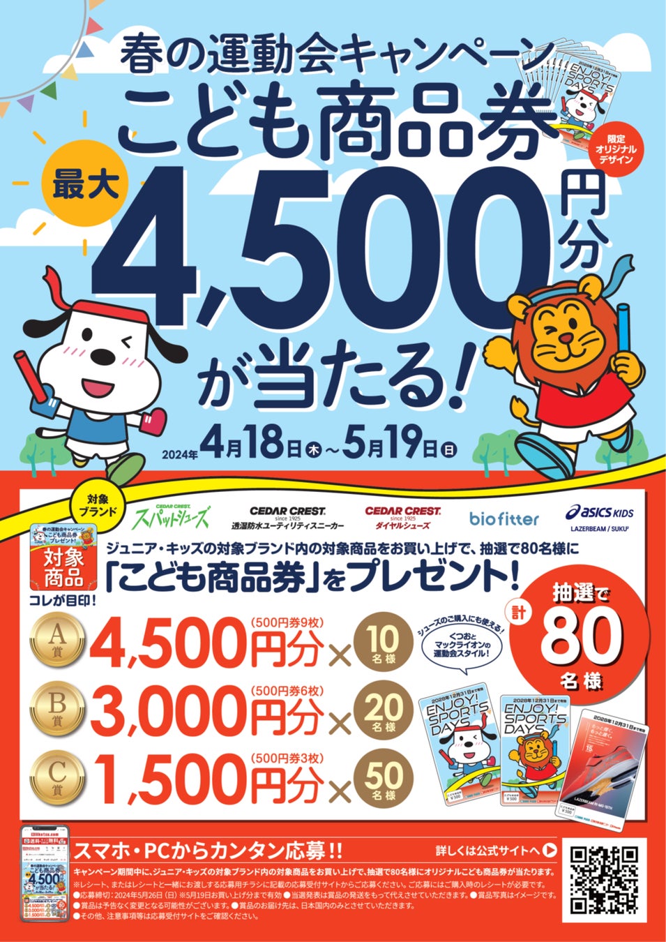 「こども商品券」が抽選で80名様に当たる!「春の運動会キャンペーン」4月18日(木)より、全国のシュープラザ、東京靴流通センター他各店舗と、公式オンラインショップ「kutsu.com」で開催!