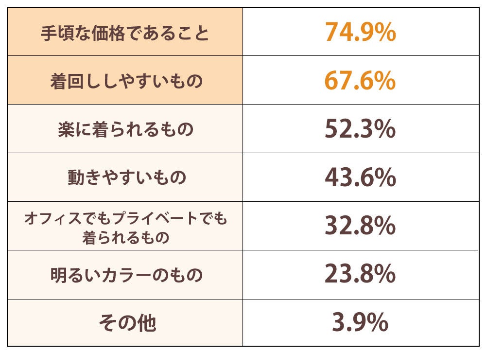■トピックス③:春服の購入時に重視しているポイントとして、約7割以上が「手頃な価格であること」と回答!シーズンが短い春はコスパが良く、着回しができるアイテムが人気の傾向に。