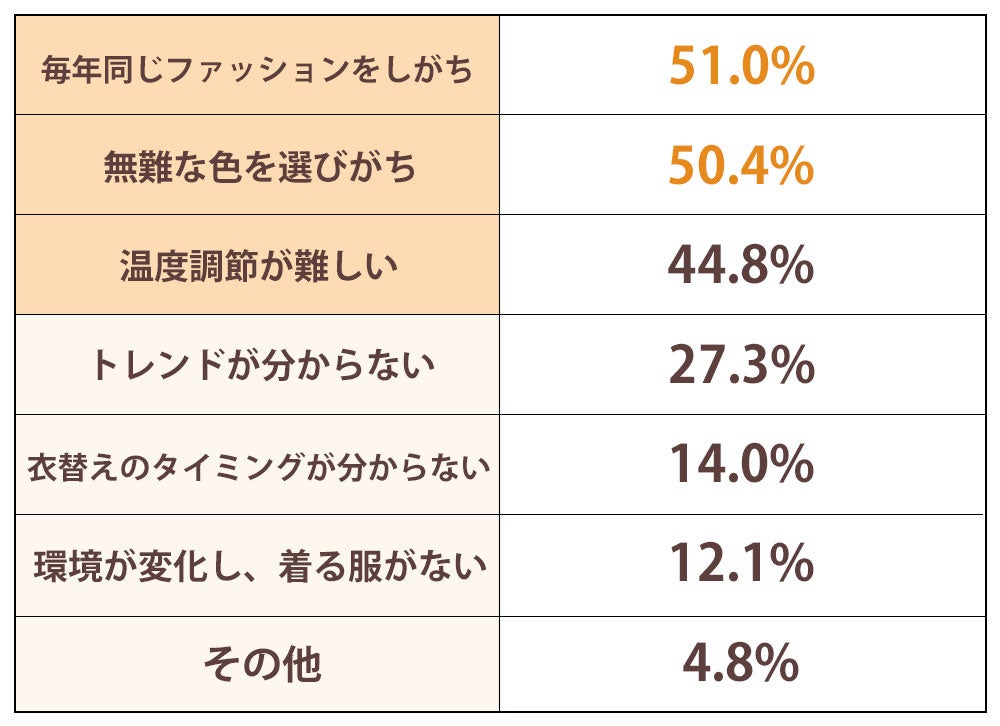 「春ファッションのお悩みはありますか?」という質問に対し、51%が「毎年同じファッションをしがち」と回答。次いで、「無難な色を選びがち」という回答が50.4%という結果になりました。春シーズンは期間が短いため、買い足す機会が少なく、昨年と同じ服を着てしまいがちなことが要因の一つだと予想されます。