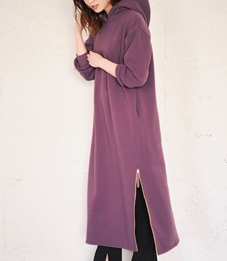 ■特長:こなれ感を演出する裾ファスナーが特長のパーカーワンピース。ふんわりとした裏起毛素材を使用しており、春先の冷え込む時期にも最適です。左右にポケットも付いており、ちょっとしたお出かけにも便利なアイテム。レギュラー丈とロング丈の2種類からお好みで選べます。