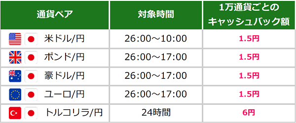 なお、「トルコリラ/円」は、24時間すべてのお取引でキャッシュバックをお受け取りいただけます。