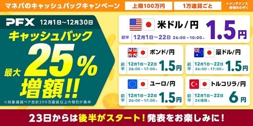 株式会社 マネーパートナーズ(代表取締役社長:福島秀治、本社:東京都港区、以下「当社」)では、12月1日より『パートナーズFX』にて、対象通貨ペアのお取引に対し、キャッシュバックを実施いたしております。