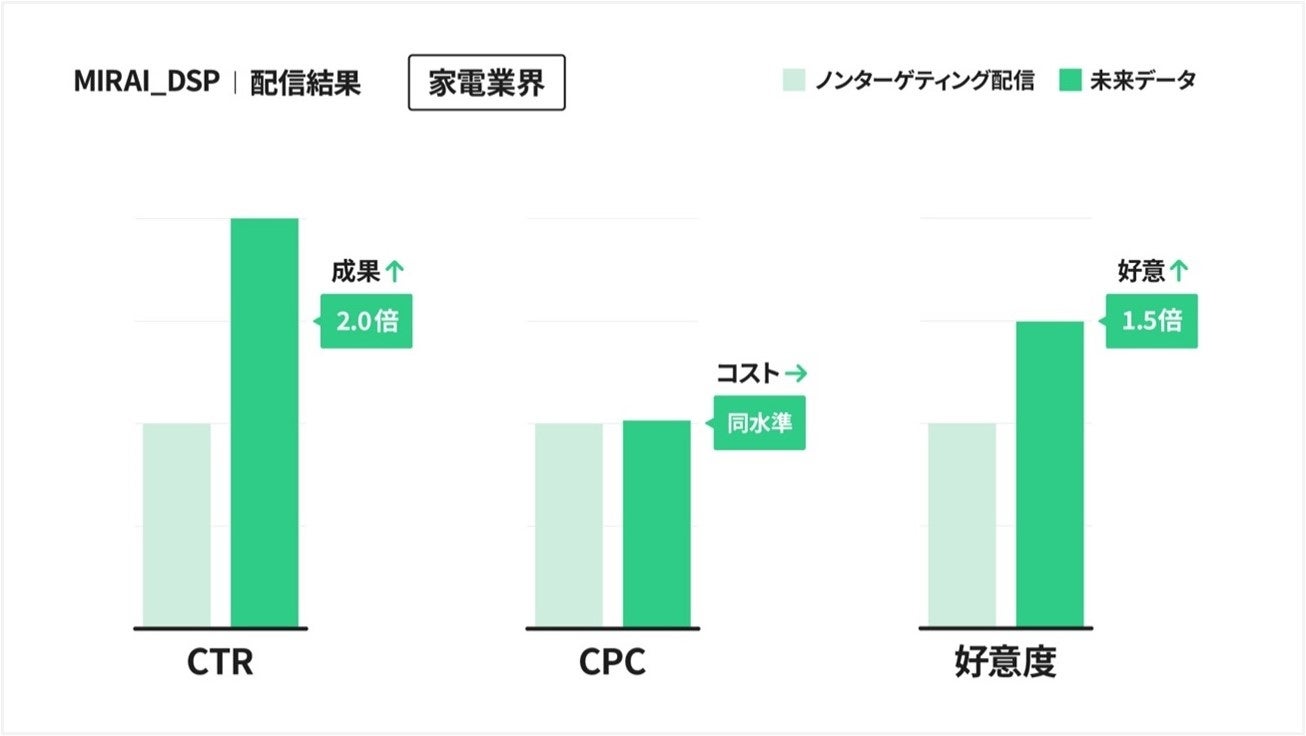 これにより、広告配信における未来データの有効性が確認され、MIRAI_DSPが、ユーザーのモーメントをとらえた広告配信を実現し、潜在的なターゲット層への効果的な訴求により、広告主のマーケティングに貢献できることが示されました。