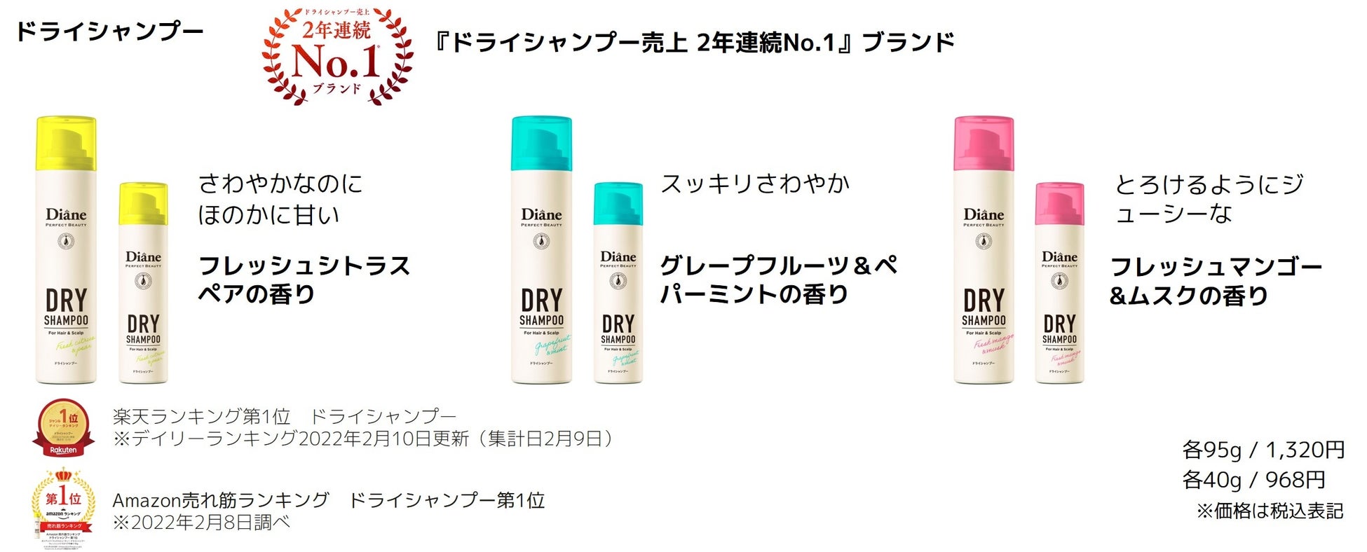 パーフェクト ドライシャンプーとは『ドライシャンプー売上 2年連続No.1』ブランド※1で、髪も頭皮もサラッとリフレッシュしたい時には必携のアイテムです。汗や皮脂による髪のべたつきを抑え、スプレータイプで心地よいリフレッシュ感で肌を引き締め、気になるニオイも抑制※2します。セラミド配合でまとまる髪へ1本ずつ再コーティングするため、ふんわりサラサラのスタイリングが復活※3します。