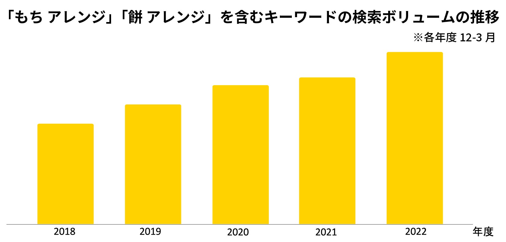 『DELISH KITCHEN』のアプリでは、毎年お正月明け〜1月中旬頃をピークに「もち アレンジ」や「餅 アレンジ」を含むキーワードの検索ボリュームが増加します。また、各年度の平均検索ボリューム(12-3月)は2018年度から年々上昇しており、2022年度は2018年度の1.7倍にまで伸びています。