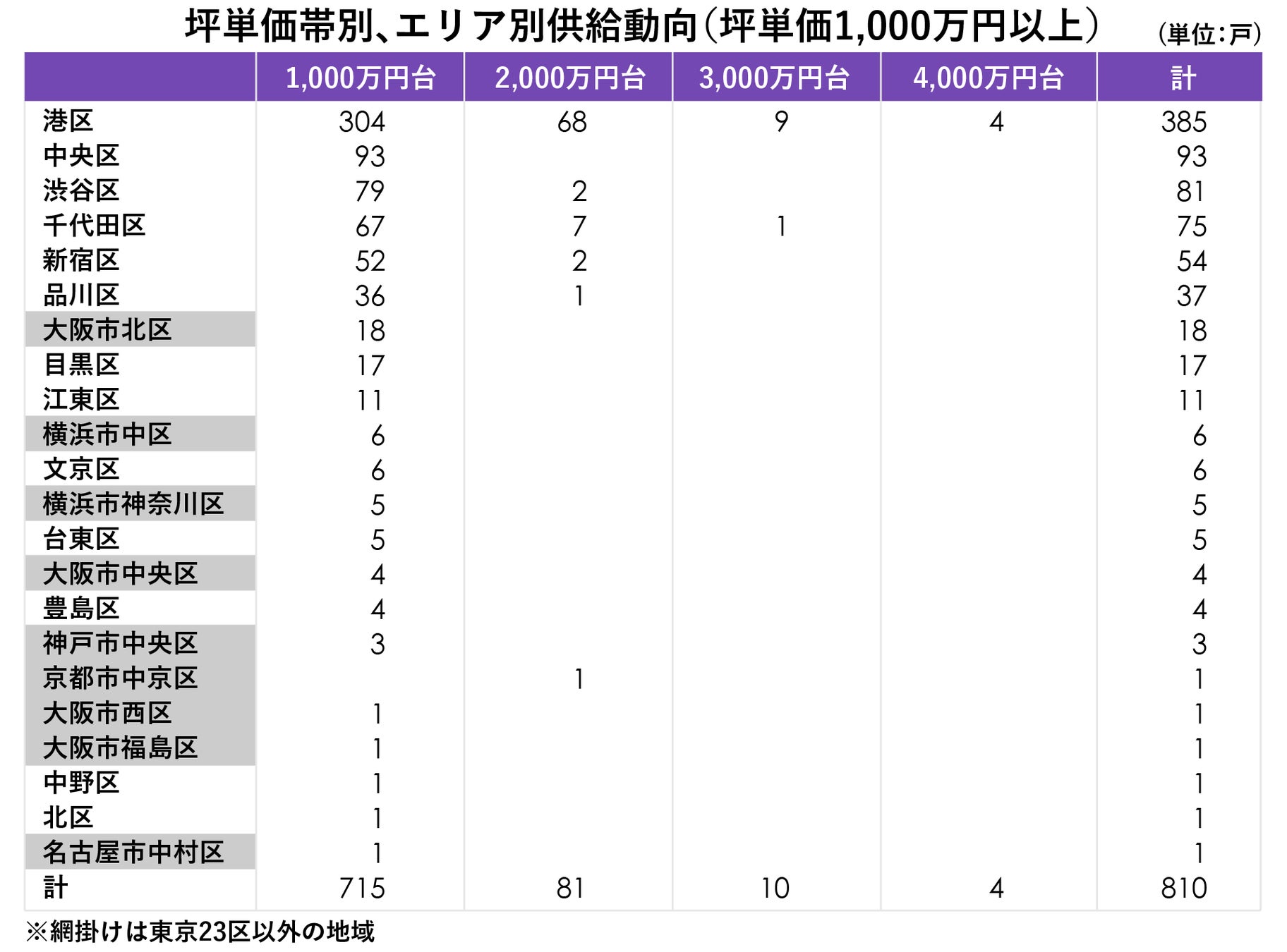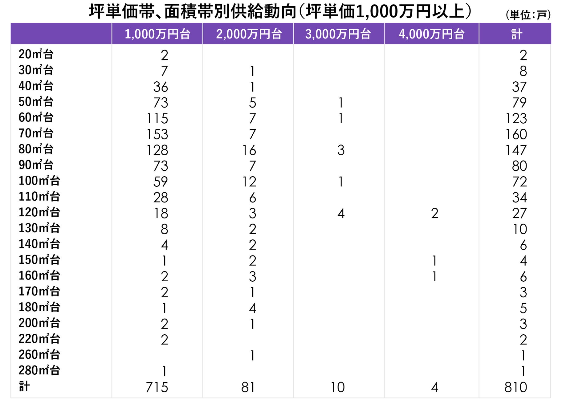 面積帯別に見ると、20㎡台のコンパクト住戸から200㎡以上の広面積プランまで幅広いプランで坪単価1,000万円を超える坪単価で供給されていることが分かります。坪単価2,000万円台でも同様の傾向が見られます。