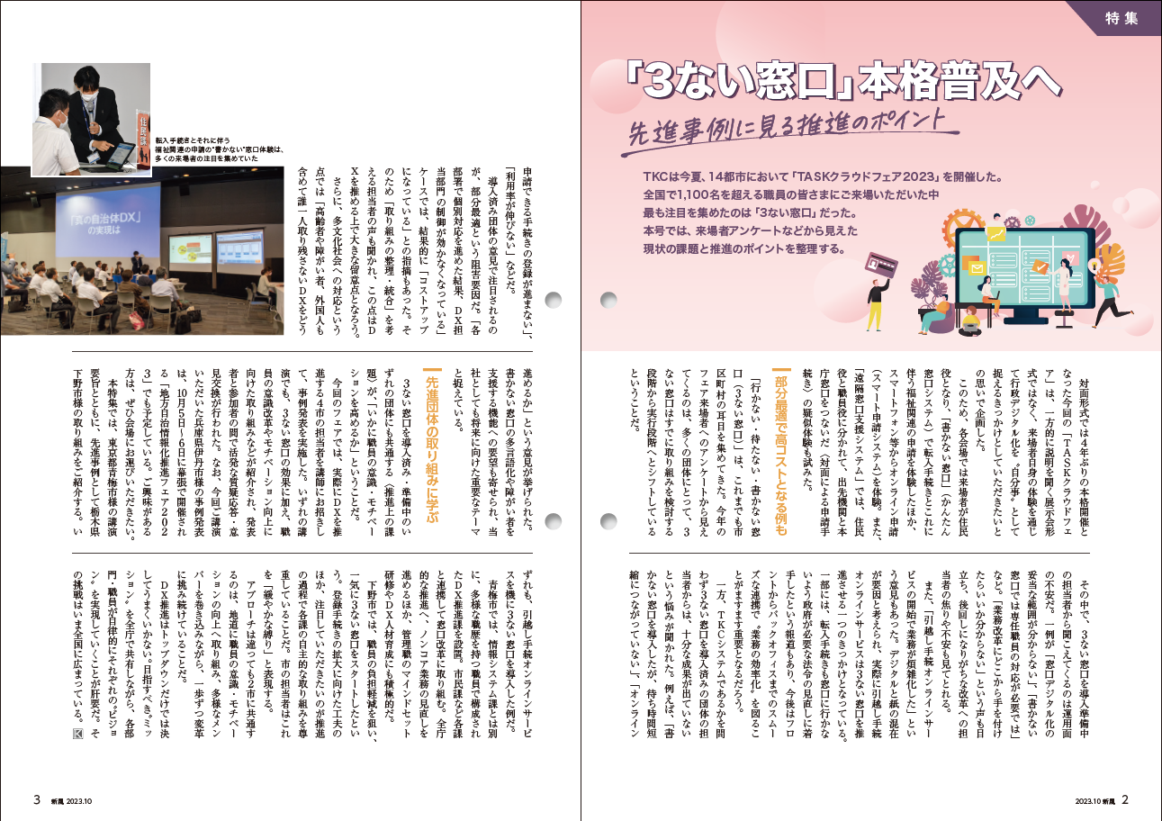 本号では、「行かない・待たない・書かない窓口」の先進事例として東京都青梅市様と栃木県下野市様の取り組みをご紹介したほか、最新動向として「地方税の電子申告等手続きの拡大」や、先頃公表された『地方公共団体情報システム標準化基本方針』の改定ポイントの解説――などを取り上げています。