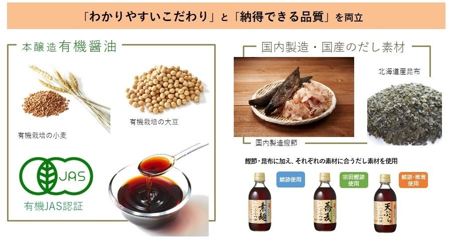 ゴールドシリーズのストレートタイプは、有機JAS認定の本醸造有機醤油と国内製造の鰹節、北海道産の昆布を使用していることが特徴です。シリーズとして「素麺」「蕎麦」「天ぷら」を展開しています。いずれも鰹節や昆布に加え、鯖節や椎茸等、それぞれの用途に合うだし素材を使用しており、素材とだしにこだわったシリーズです。
