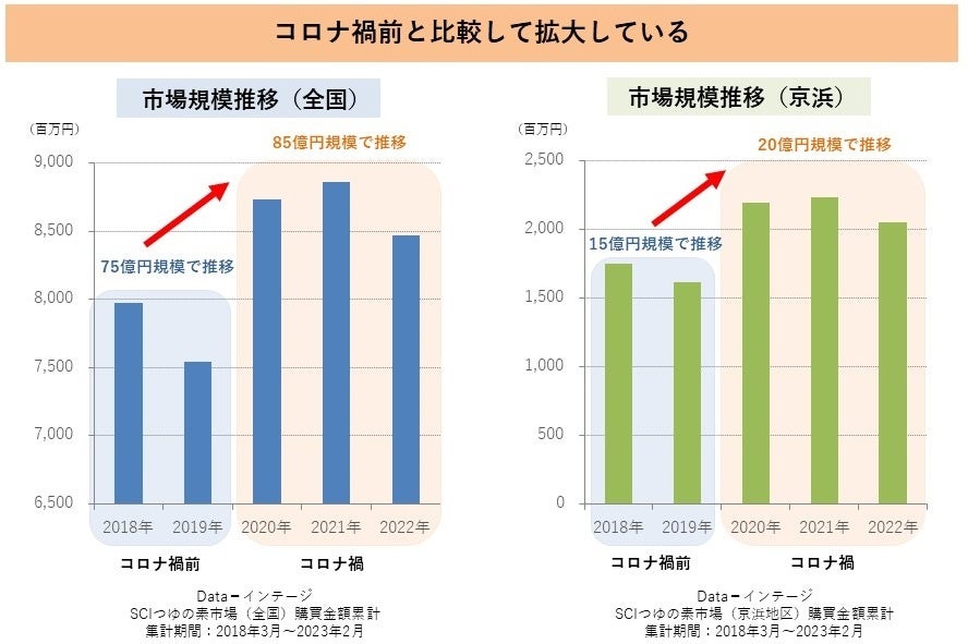 鍋つゆを除く液体つゆのストレートタイプの市場規模は、コロナ禍前の2018年2019年は全国では75億円規模、京浜地区では15億円規模で推移していたのに対し、コロナ禍の2020年以降は全国では85億円規模、京浜地区では20億円規模で推移と、コロナ禍を境に伸びています。