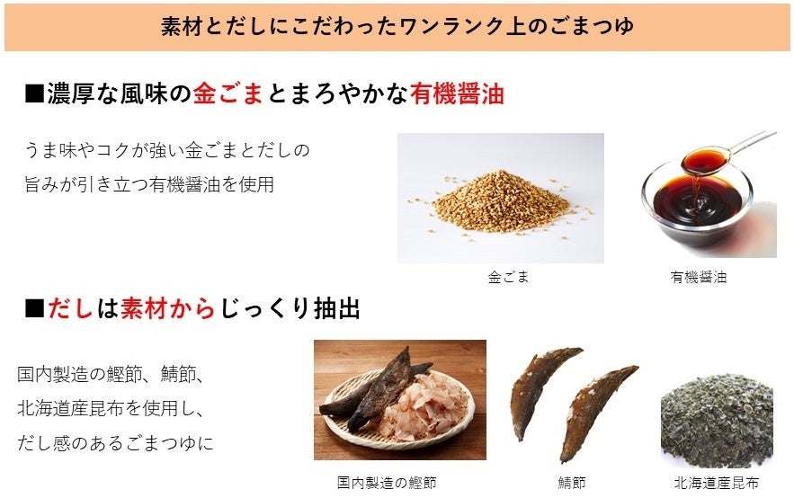 ごまはうま味やコクの強い、濃厚な風味の金ごまを、醤油はだしの旨みが引き立つまろやかな有機醤油を使用。だしは国内製造の鰹節、鯖節、北海道産昆布の3つの素材からじっくり抽出することで、だし感のあるごまつゆに仕上げました。ゴールドシリーズのだしは、家庭でだしを取るように、昆布は水に浸けてから煮出し、沸騰する前に引き上げています。鰹節は1番だし、2番だしをしっかり抽出して、鰹節だしのうま味を逃さないようにしています。