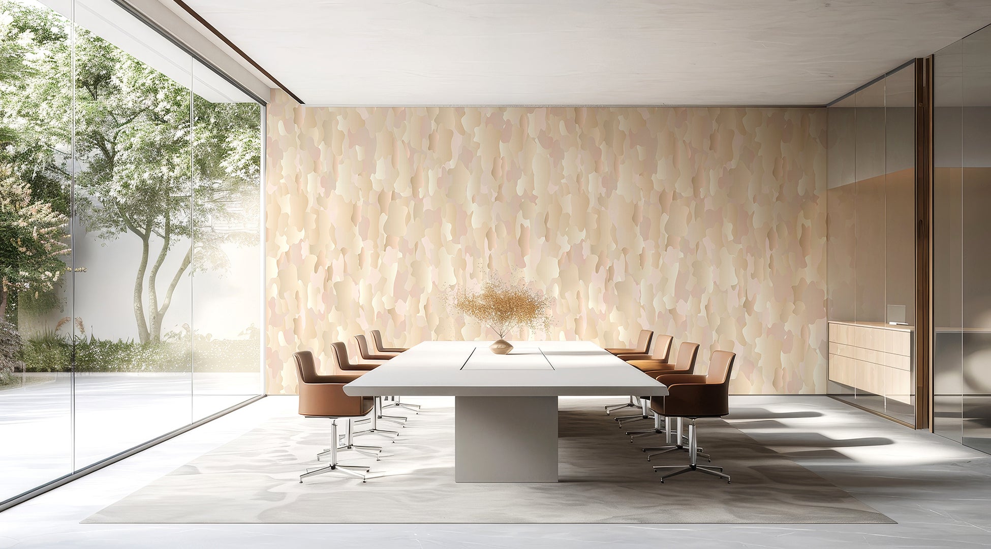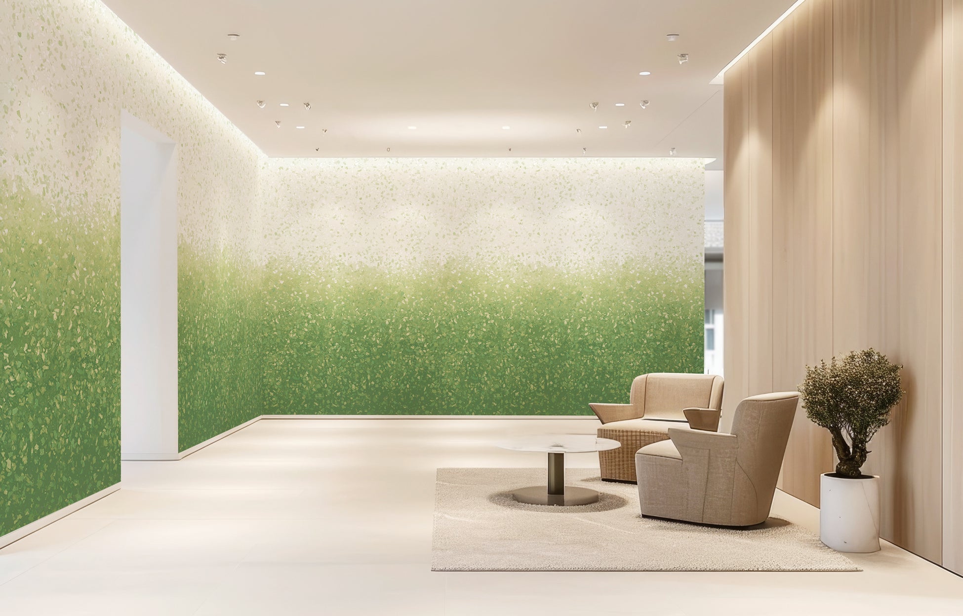 "金属下地"にも対応した粘着剤付き塩ビシートマテリアル。ビニルクロスの「WhO Wallpaper」よりも耐擦過性に優れ、ホテルや複合ビルのエントランスにエレベーターホール、オフィス共用部やショッピングモールの柱周りの装飾など、さまざまな形状や大型壁面にも適したマテリアルです。