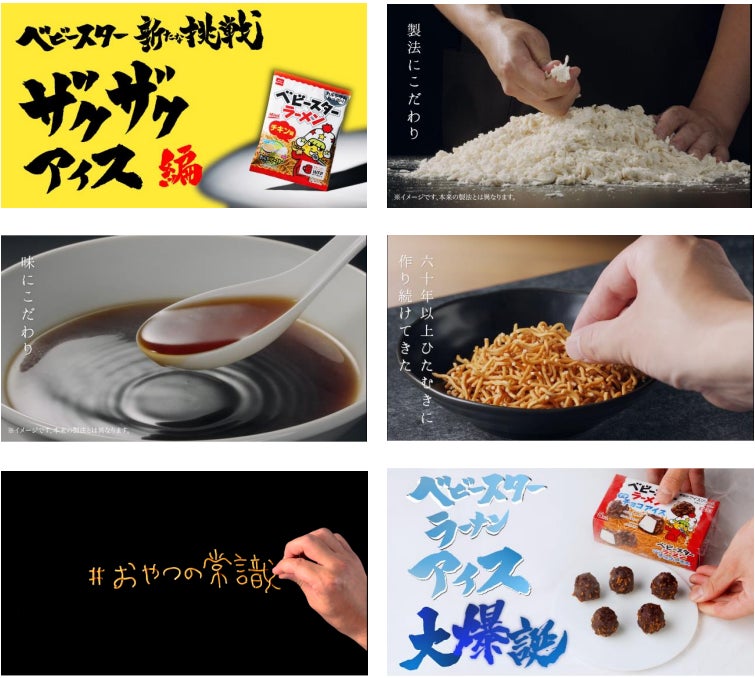 また、今回のコラボを記念し、ベビースターが歩んできた63年間のこだわりや、今回のおやつの常識を超えた挑戦を、たっぷりのシズル感や麺文字で表現した遊びゴコロ満載のPR動画も公開いたします。