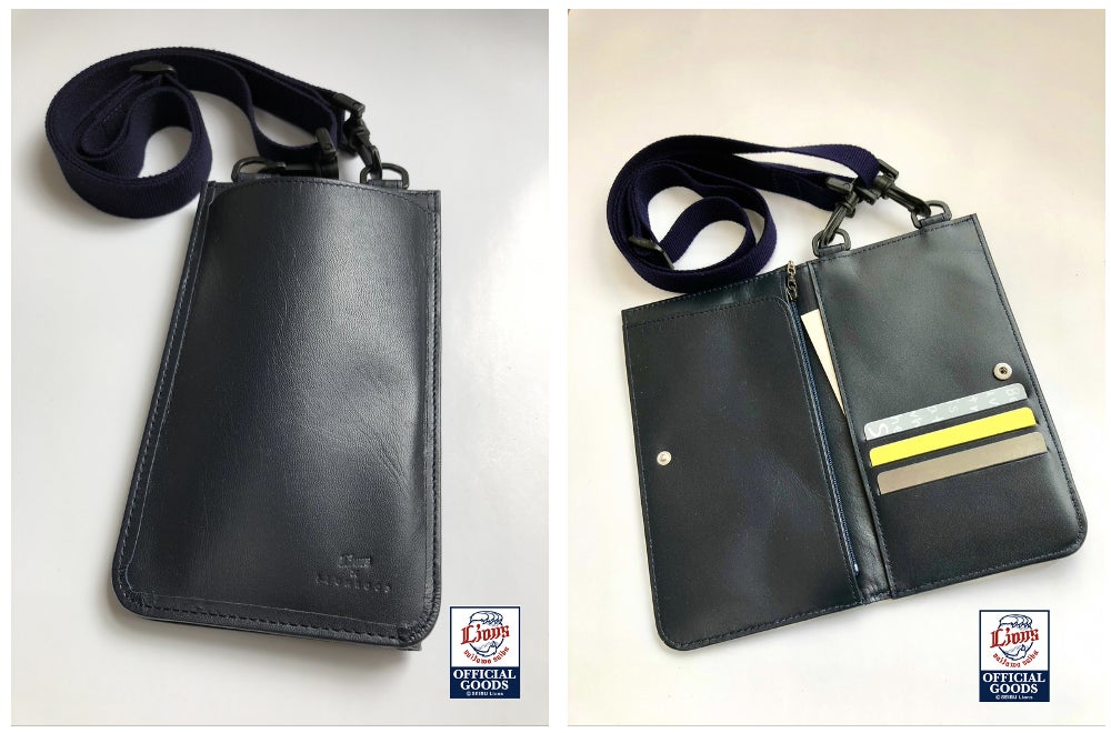 雨や水に強い皮革保護剤が施された革を使用したマルチウォレットです。外側のポケットにはスマートフォンが収納でき、内側には小銭やお札を入れられるチャック付きのポケットや、チケットやファンクラブカードなども収納できるフリーポケットがあります。球場内で手を塞がれることなく貴重品を携行でき、試合観戦を楽しめます。