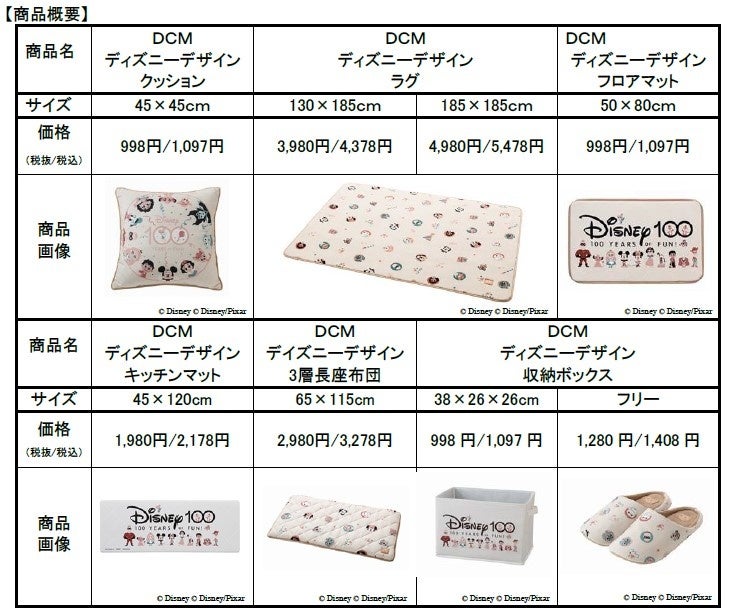 このたびディズニー創立100周年を祝し、人気のキャラクターデザインのインテリア用品( クッションやラグ、収納用品などを発売いたします。人気のキャラクターが揃ってデザインされたDCMオリジナルの統一感のあるインテリア用品はディズニーファンだけでなく、様々なお客さまに楽しんでいただける商品です。