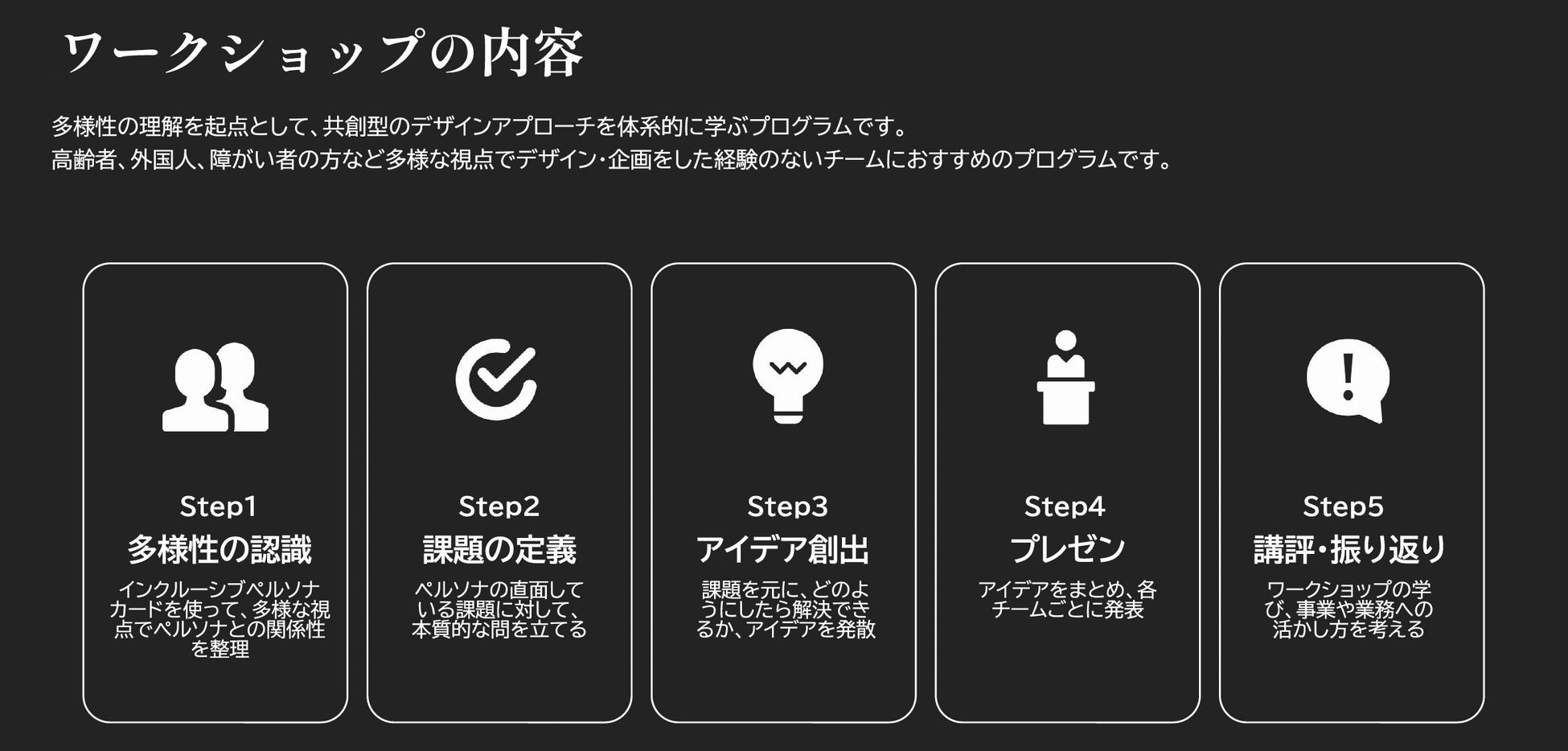Step1:多様性の認識: インクルーシブペルソナカードを用い、特定のテーマ(※)における移動や利用のバリアを可視化する 。 Step2:課題の定義: 身体的・心理的・環境的な要因から、ペルソナが抱える「真の課題」を特定する 。 Step3:アイデア創出: 「その人の課題」を解決しつつ、結果として「多くの人」にとっても便利になるアイデアへ昇華させる 。 Step4:共有・発表: チームごとのアイデア共有。 |