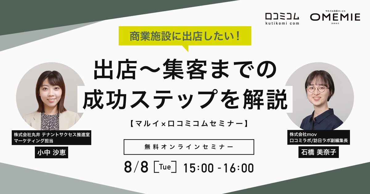 そこで今回は、テナント様のスペース探しから出店までを支援する、マルイの出店サービス「OMEMIE」より、『商業施設出店事例から学ぶ、出店までの3つのポイント』、そしてWeb集客のノウハウを持つ「口コミコム」より、『商業施設に出店した後の集客でやるべきこと』について解説します。