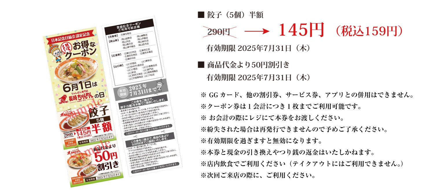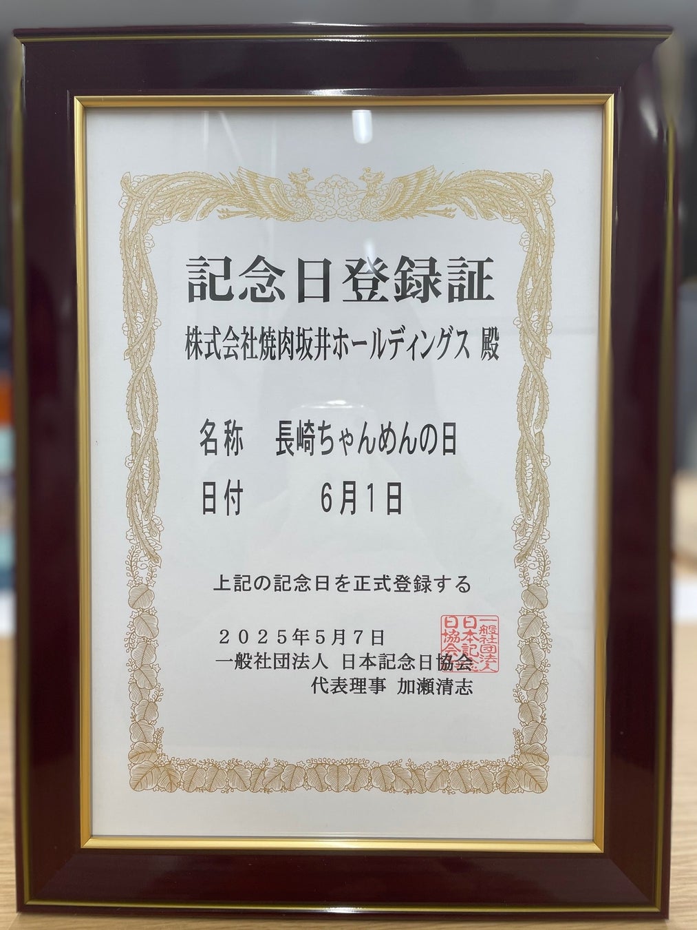 株式会社 焼肉坂井ホールディングス(本社:名古屋市北区、代表取締役社長 髙橋仁志)は毎年6月1日を「長崎ちゃんめんの日」として一般社団法人 日本記念日協会に申請し、承認をいただきました。記念日は1号店がオープンした日が1971年6月1日(火)に由来いたします。そして、長崎ちゃんめんではこの記念日制定キャンペーンとしまして6月1日(日)~ 6月8日(日)までクーポン券を配布いたします。餃子(5個入り)が半額および商品代金が50円引きの特典でございます。配布は無くなり次第終了でございます。皆さまのご来店をスタッフ一同お待ちしております