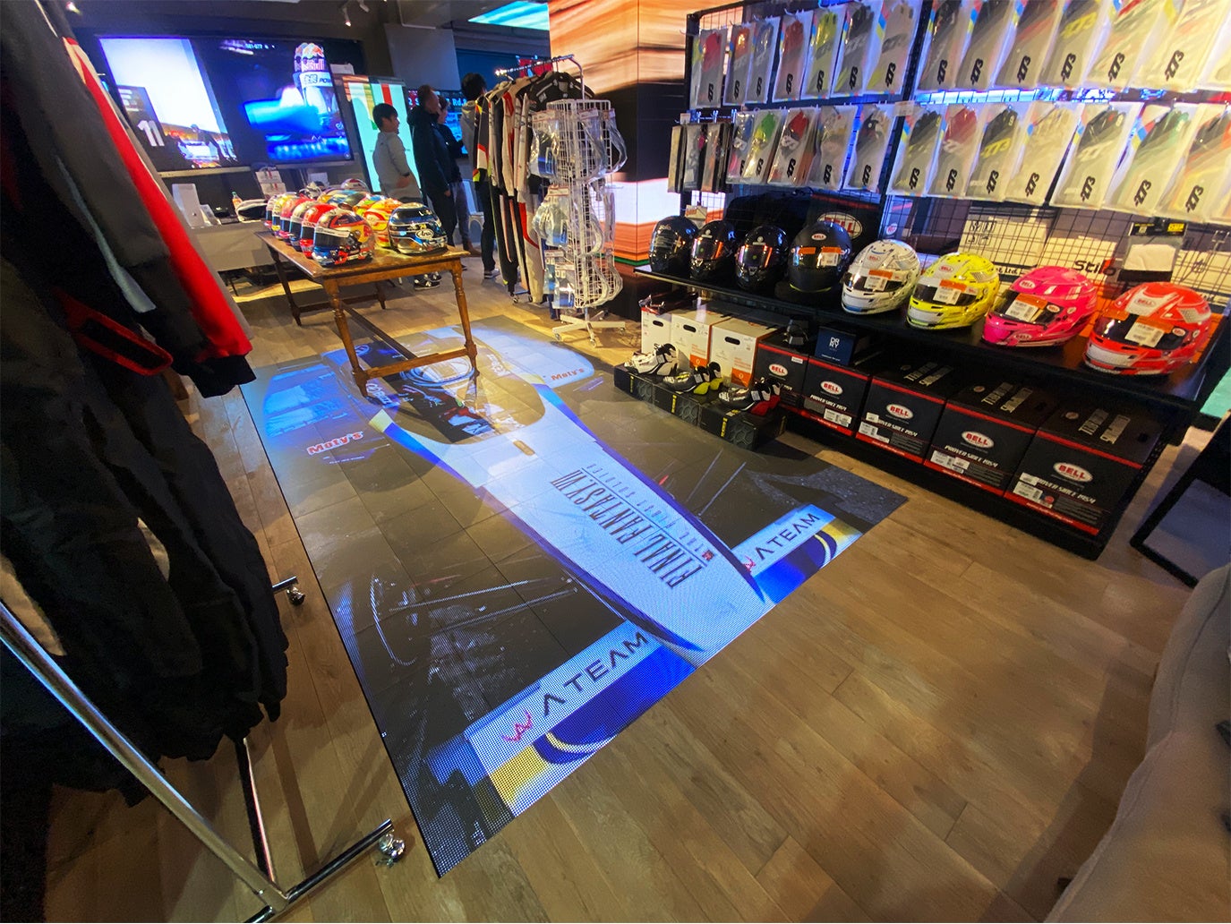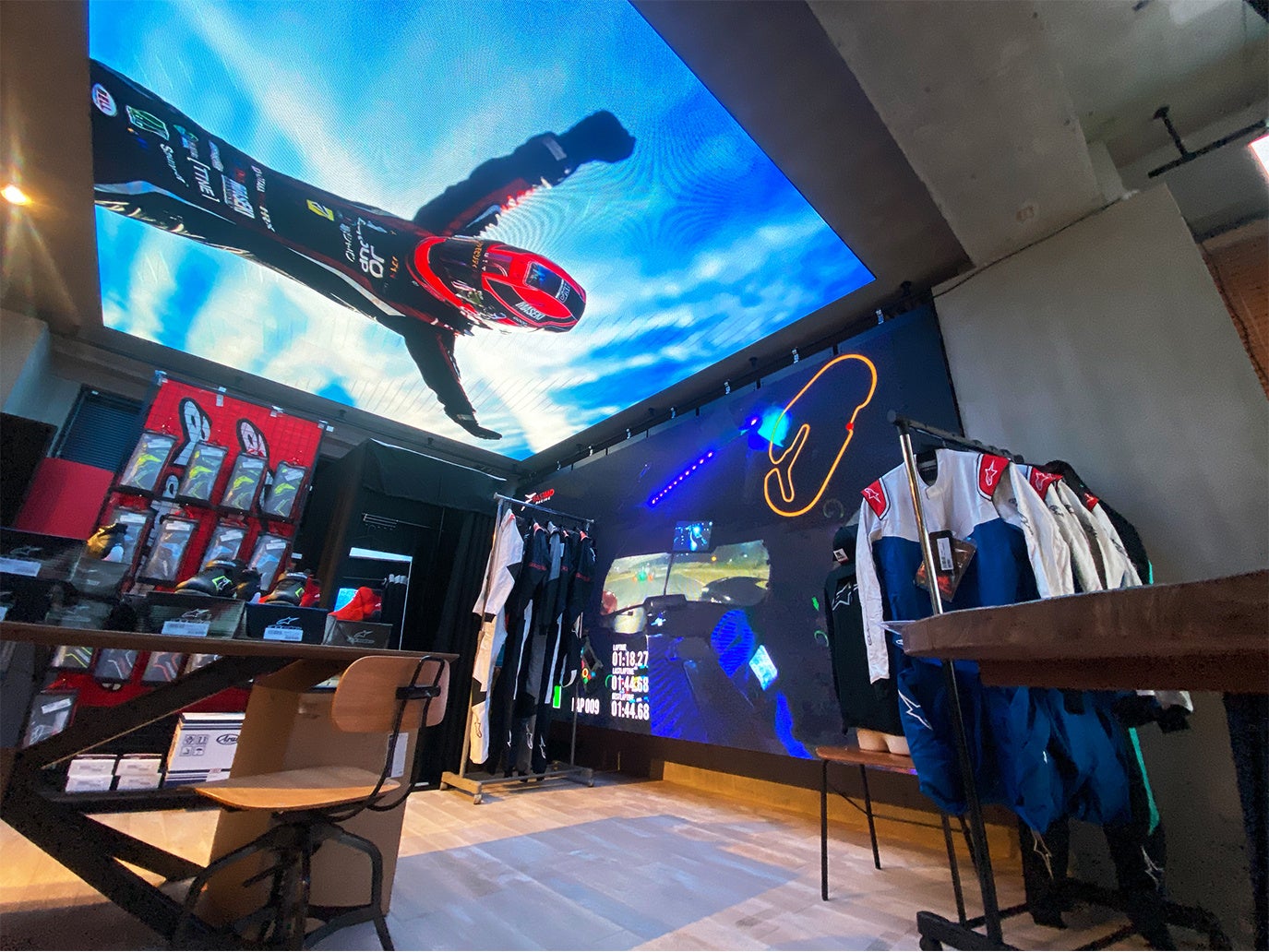 会場には、Alpinestars、OMP、-273、STILOレーシングギアをはじめ、トップドライバーのヘルメットや、フォトグラファーSHO TAMURAさんの作品展示などが行われました。各展示アイテムの試着、購入、オリジナルスーツデザイン、ヘルメットデザインなどの相談を専門のスタッフが丁寧に対応します。