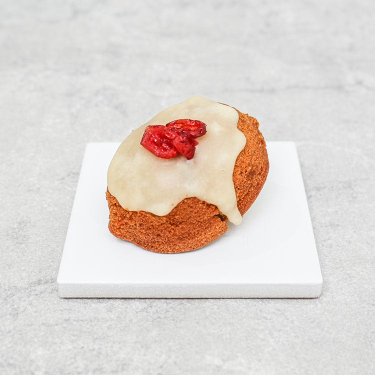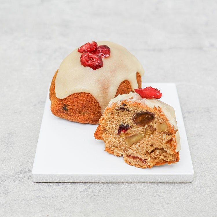 香り豊かなスパイスと紅茶の風味をぎゅっと閉じ込めた、かわいらしいサイズのヴィーガン&グルテンフリーシュトーレンです。紅茶漬けのレーズン、ドライクランベリー、ドライみかんに、ローストした胡桃とアーモンドの香ばしさを合わせ、ひと口でふわっと広がるスパイスとフルーツの香りが贅沢な余韻を残します。ナッツやフルーツがごろっと入った楽しい食感は飽きのこない味わいで、ティータイムにちょうどいいサイズ感。仕上げにはメープルアイシングとドライクランベリーをのせ、やさしい甘さの冬のご褒美に仕上げました。
