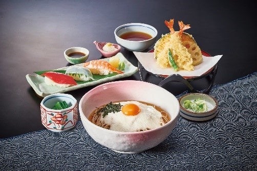 とろろそばは、厳選素材の大和芋を使用した、香り・味・粘りにこだわったサガミ自慢のとろろと店内製麺のそばが絡み、滑らかな食感と深い旨味が特徴の逸品です。寿司と天ぷら、小鉢がついたお得なセットメニューです。