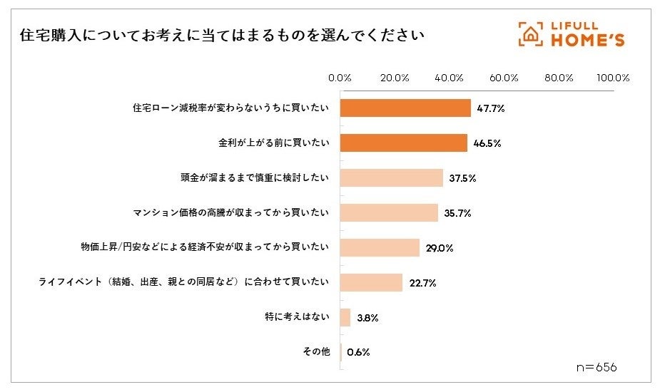 現状では、特に新築物件の価格が高騰しており、住宅ローン金利の先高観が強まることで「客観的な買い時」が終わりに近づいているとの印象がユーザーにあり、市況の先行きに関する不透明感も手伝って、なるべく早く買わないと買えなくなるのではとの不安が拡がっていることがアンケート調査によって明らかになりました。