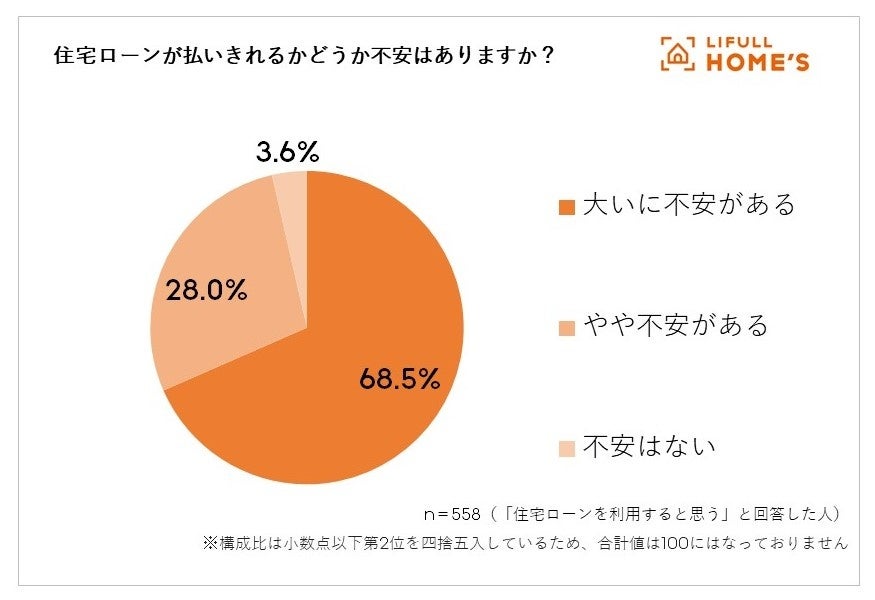 - 住宅購入時に、住宅ローンを利用する予定の人は約85%。そのうち、住宅ローンが払いきれるかどうか不安がある人はなんと約96%も。
