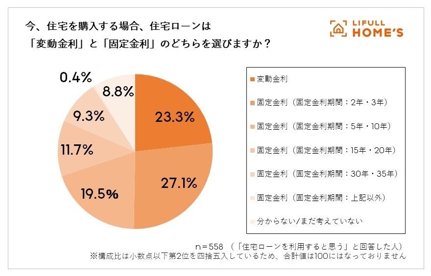 - 住宅ローンは、「変動金利を利用予定」の人がわずか23.3%。対する「固定金利」は67.9%