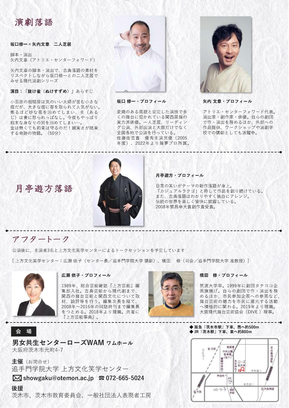 上方文化笑学センターは、「笑い」を中心とした上方文化に関する情報発信や、コミュニケーションツールとしての「笑い」を、文化や生活、人間関係などの観点から追究するセンターです。今回は「落語」にまつわる舞台芸術作品を取り上げ、学生だけでなく地域の方に、文化・芸能に触れて楽しんでもらおうと開催するものです。終演後は、出演者と上方文化笑学センター員によるアフタートークも予定しています。