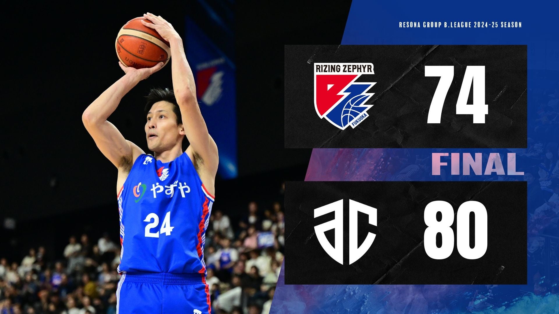 2024年10月19日(土)に開催した、りそなグループBリーグ 2024-25シーズン【ライジングゼファーフクオカvs.アルティーリ千葉】において“福岡74-80A千葉”の結果となりましたことお知らせいたします。