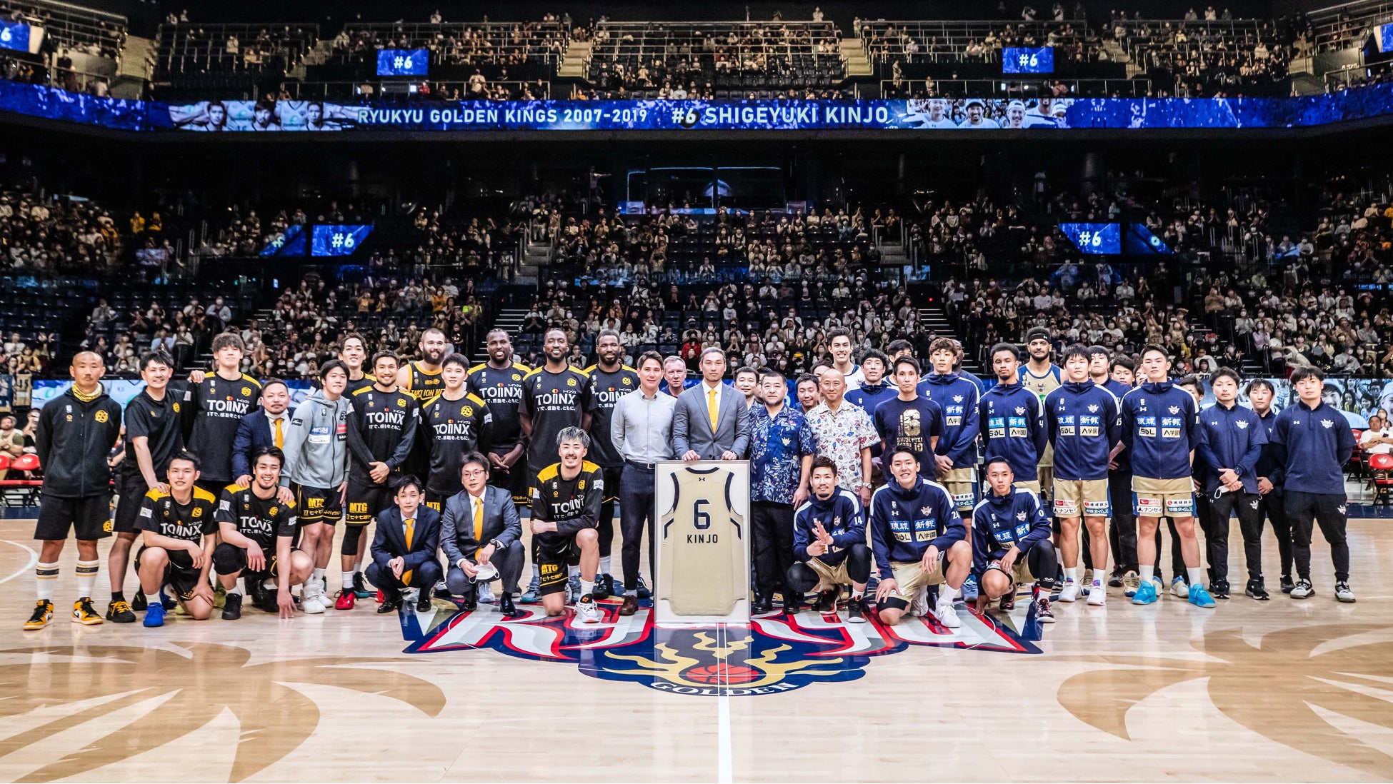 永久欠番セレモニーでは金城氏のキャリアを振り返る特別映像放映後、bjリーグ初年度から使用されていた懐かしい選手入場BGMと共に金城氏が登場し、安永ゼネラルマネージャーより背番号「6」の永久欠番ユニフォームが贈呈されました。