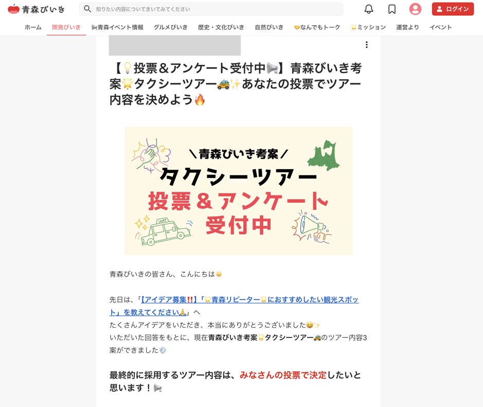 タクシーツアー、ホテルのコンセプトルームについてアイデア募集から投票まで共創し、青森県内外からの観光客の誘致を目指します。