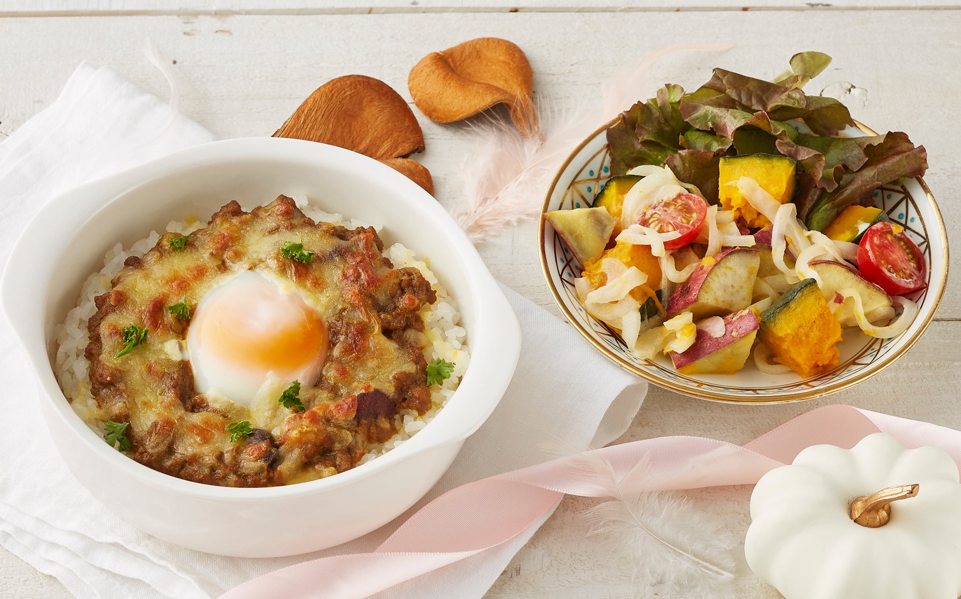 合挽き肉と玉葱、ミックスビーンズが入って具材感たっぷり!Lovyuオリジナルのドライカレーをドリアにアレンジしました!サラダはかぼちゃとさつま芋でハロウィン仕様に。