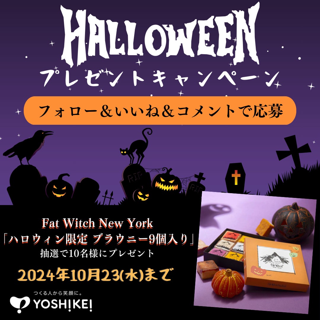 つくる人から笑顔に。をテーマに全国でミールキット宅配サービスを提供するヨシケイグループ(本部所在地:静岡県静岡市 / 代表取締役:井野口 雄一)は、日ごろの感謝を込めヨシケイ公式Instagramで「ハロウィンプレゼントキャンペーン」を開催します。10/14(月)~10/23(水)を応募期間とし、抽選で10名様にFat Witch New York「ハロウィン限定 ブラウニー9個入り」をプレゼント。また、ヨシケイのメニューブック『すまいるごはん』『Lovyu』『和彩ごよみ』の一部のメニューコースでもハロウィンに合わせたメニューが登場し、イベントを夕食から盛り上げます。