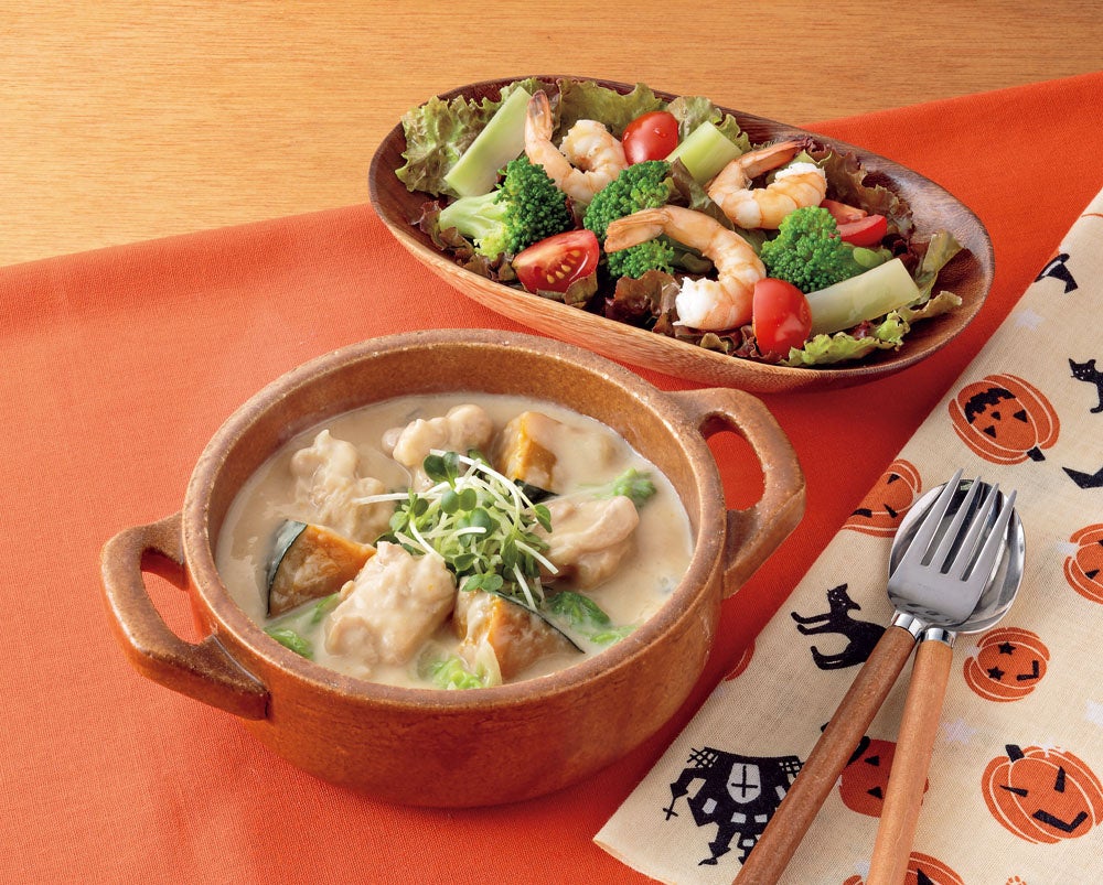 ホクホクとした食感がおいしいかぼちゃを、豆乳とみそで和風仕立てのシチューにしました。ハロウィンメニューにいかがですか♪