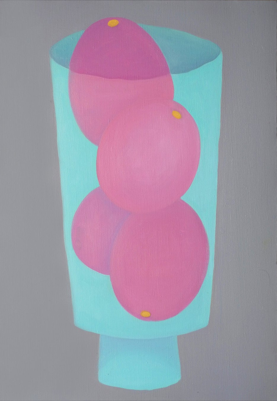 果物や手足といった身近な存在を、有機的な形態と柔らかな中間色で表現する油絵を制作しています。重なりや透過によって生じるわずかな変化に関心を持ち、そこに現れる描かれたもの同士の関係性や、視点によって変化するイメージを描くことを試みています。近年は、実際に目にした海や空をモチーフに、風景の再現性と抽象性のあわいを探る制作にも着手しています。