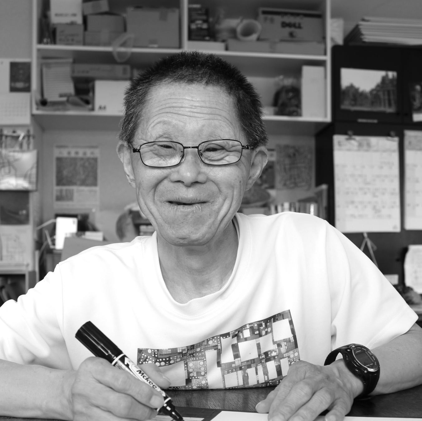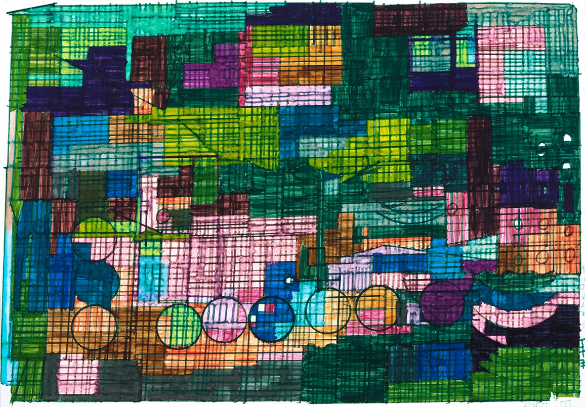 色鮮やかな作品の中に、目を引く四角や丸の白い空間。一見抽象的な幾何学パターンを描いたように見える絵だが、それが独自のアレンジによって描かれた建築物や乗り物だと知ったら多くの人が驚くだろう。子どもの頃、彼はこの表現様式を誰に習うことなく独創によって生み出す。以来、半世紀余りにわたってただ一つの手法で創作し続け、その作品数は数百点に及ぶとされる。アトリエの一角で、机からはみ出るほどの大きな画用紙に、フェルトペンを握りしめながら大きな定規を巧みに扱う彼の姿からは、何年もの長い年月を感じ取ることができる。