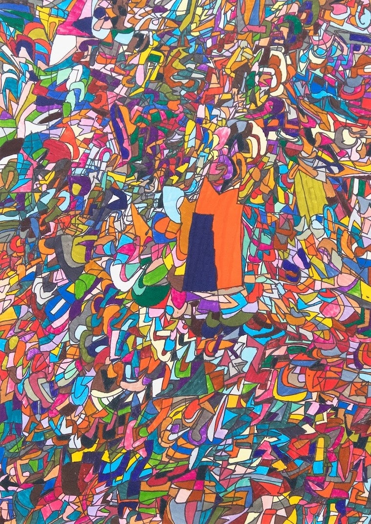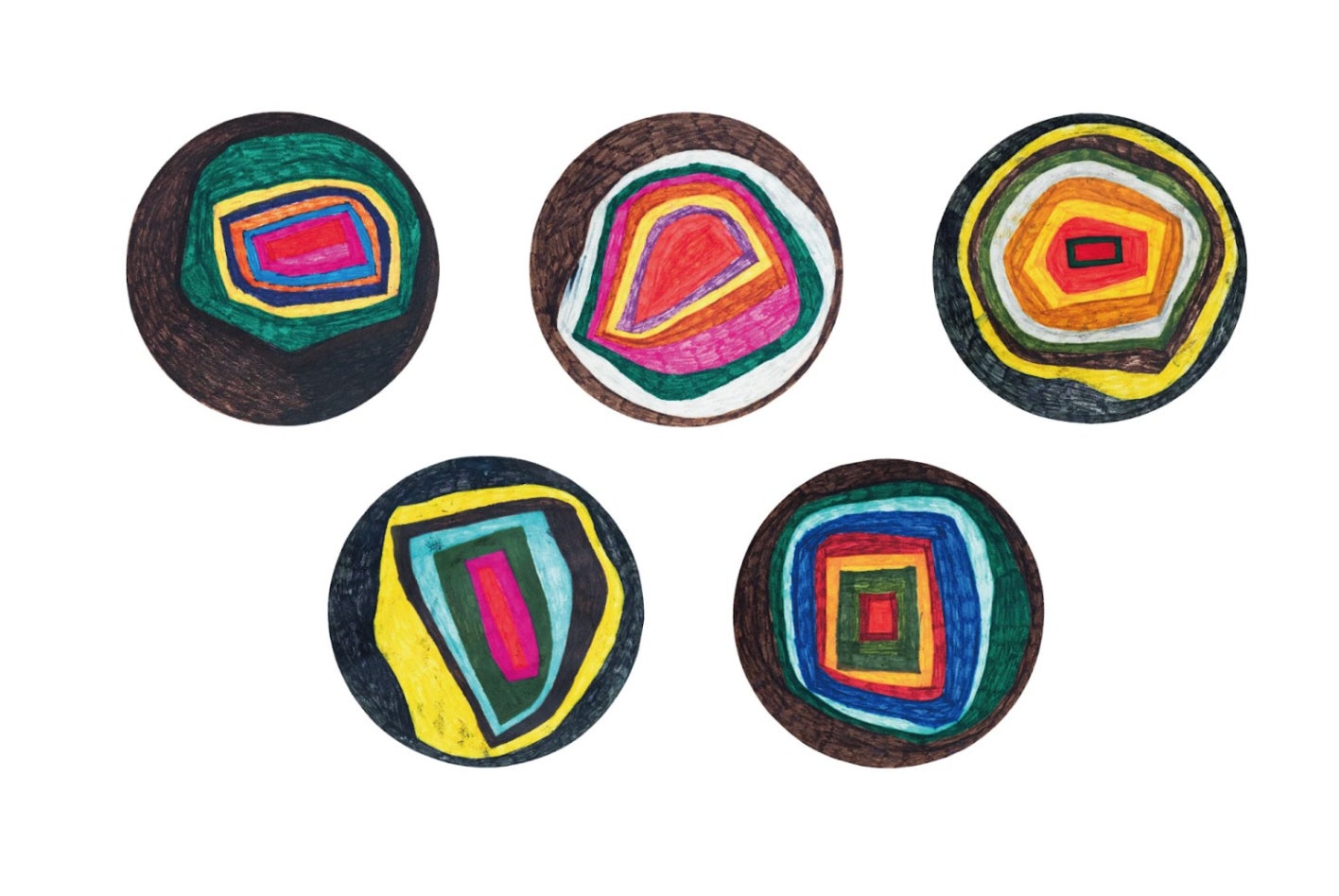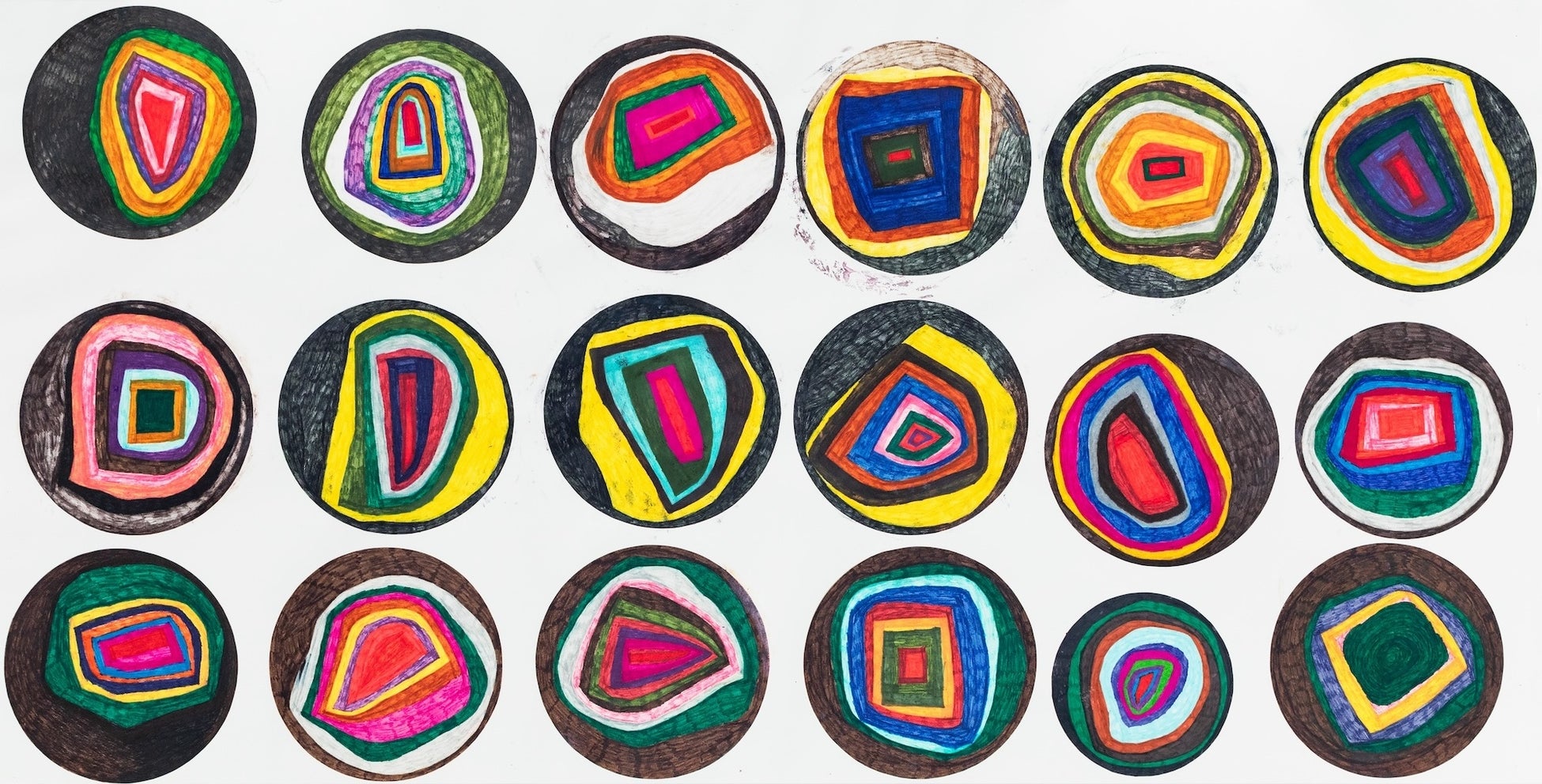 ステンドグラスのようにカラフルで、何らかの規則性を持って描かれた幾何学模様。ボールペンの跡が残るほど執拗に何度も何度も書きつけられた黒い丸。ランダムに見えて実は数字や文字が潜んでいる絵──。