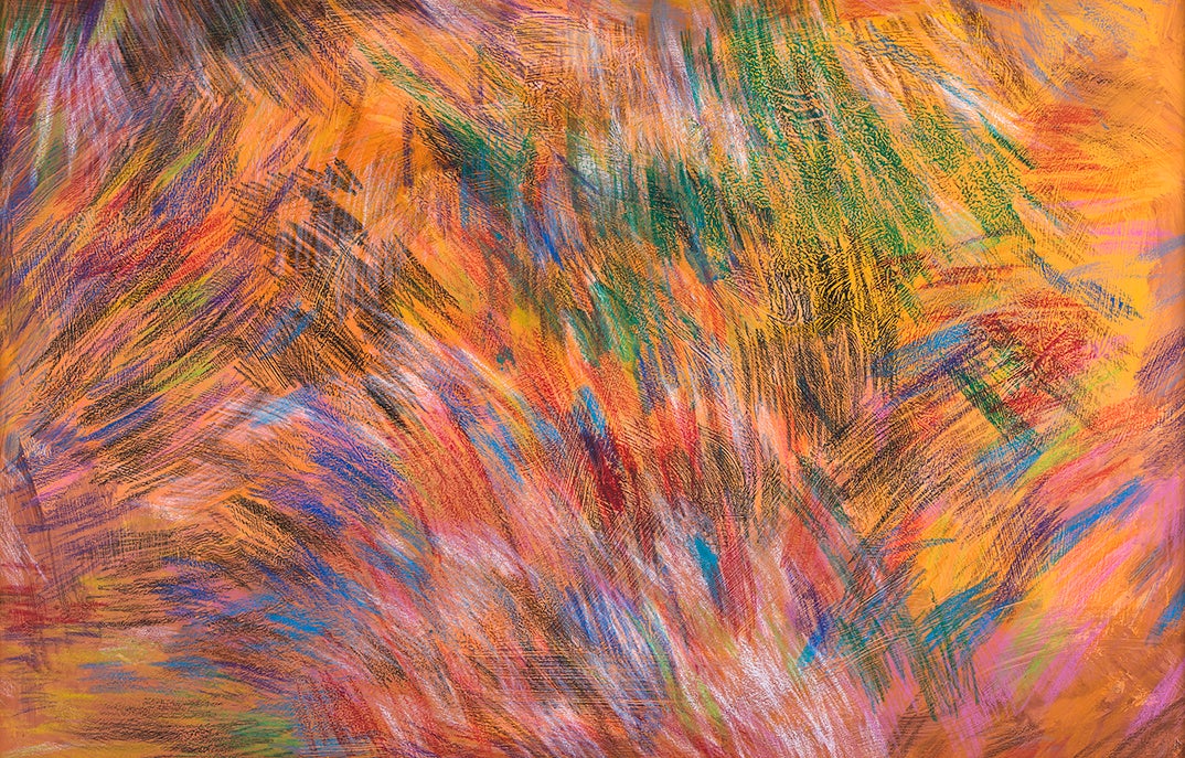 クーピーペンシルやクレヨンを塗り重ねることで作り上げられた作品は、一見すると、素早い鉛筆の動きを要する激しい制作態度を連想させる。しかし実は、彼女の制作は非常にゆっくりと穏やかである。彼女の描き出すひとつひとつの色は、お互いに交じり合うことなく、それぞれにその美しさを主張しながら画面の上に現れ、激しさと静けさが不思議に同居しており、心を惹きつけられずにはいられない。