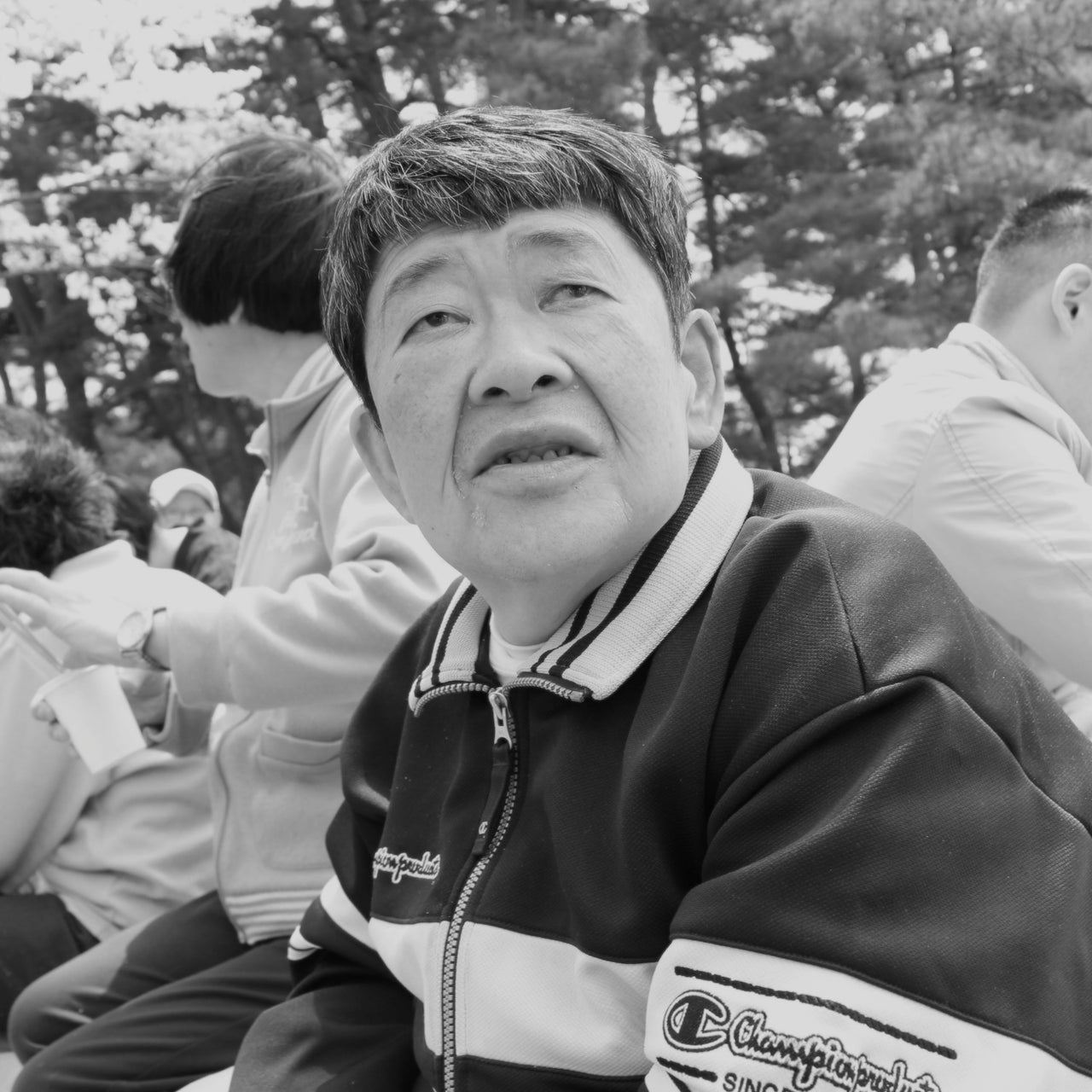 るんびにい美術館アトリエを拠点に活躍した昆。その制作活動の始まりは、ささやかなものでした。小さなノートをポケットに入れて持ち歩き、時折ありあわせのペンでシンプルな人の形を描き込む。丸い輪郭の中に、丸い目、棒のような鼻。「これ、○○さん。」そう言って、そばにいる人にノートを見せて会話の種にすることも、彼の楽しみであるようでした。その描画は年を経てゆっくりと密度を増していき、やがて大画面の作品を手掛けるようになりました。モチーフは「人」だけです。とてもシンプルな人のかたちを、一度描いた上からさらに幾たびも重ねていくことで、画面はいつしか強烈な存在感を放つものへと変化していきます。