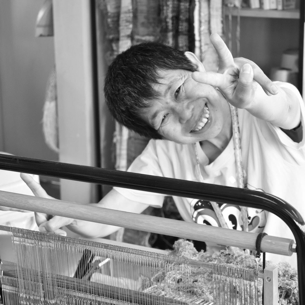 もともとはアトリエの共同作業として行われていた草木染の毛糸を球状に巻き取る仕事を担当していた似里。はじまりは巻き取る際にからまってしまった糸を切ってほどき、結び直したことがきっかけだった。しかし人目を忍んで、売り物の糸をこっそり「切っては、結ぶ」を繰り返すようになったという。「切っては、結ぶ」所作がお気に入りとなった似里は今、毎日アトリエで背中を丸め、指が鼻にくっつきそうなほど近づけて、ひとつずつ丁寧に結び目を作る。何時間にもわたって途切れることのない集中力。結び目がぴょんぴょん飛び出しながら丸まっている糸玉は、花びらのようなかわいらしさがある。きょうも彼は黙々と、切っては、結ぶを繰り返す。
