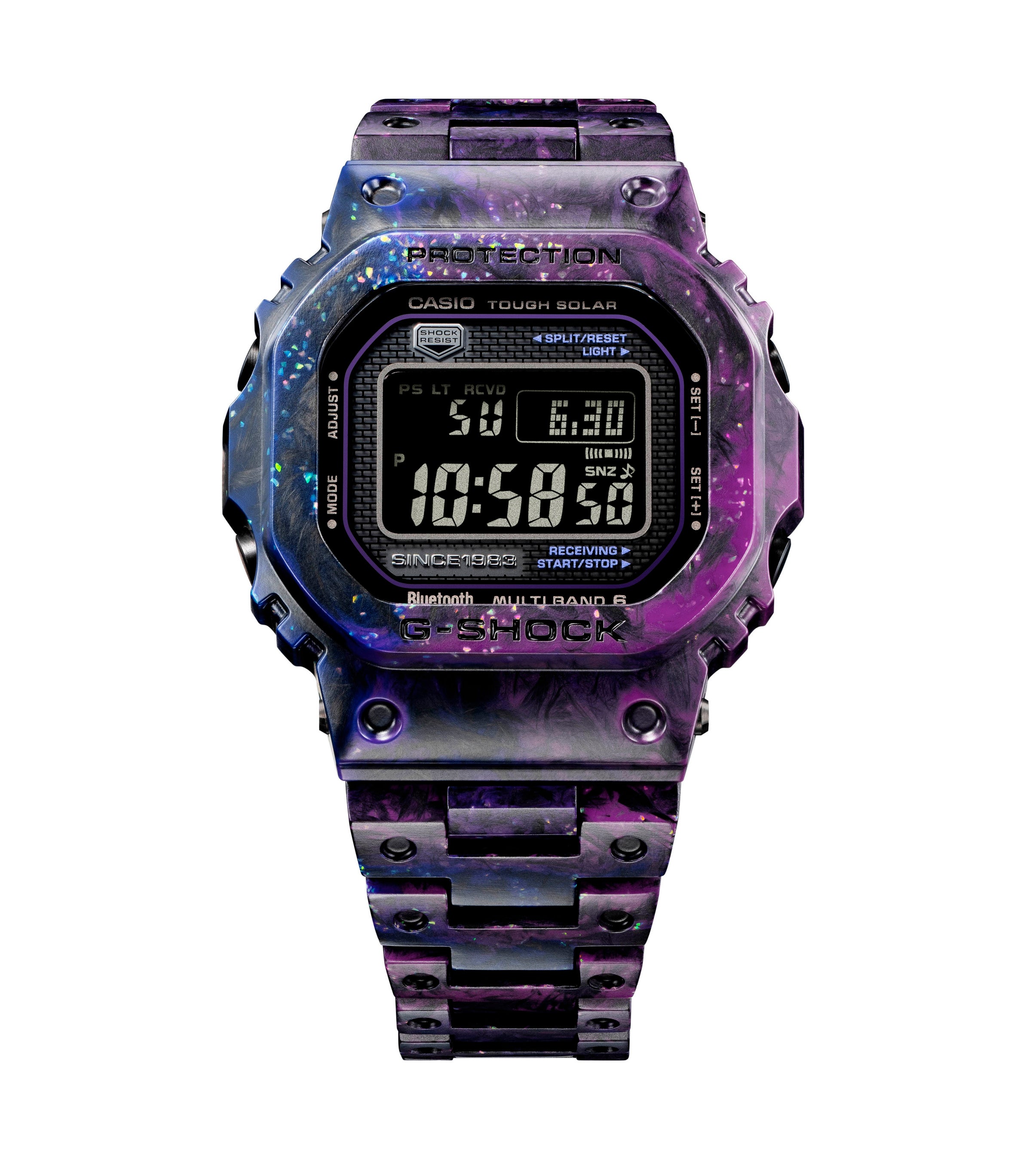 進化を続ける“G-SHOCK”を、広がり続ける宇宙空間と重ね合わせ、ビッグバンや惑星をモチーフにデザイン。ベーシックなブラックに加えて、混色成形を行ったパープルの2モデルをラインナップしています。背面にはグラフィックアーティストのエリック・ヘイズ氏による40周年記念ロゴを刻印するなど特別感あるモデルに仕上げました。