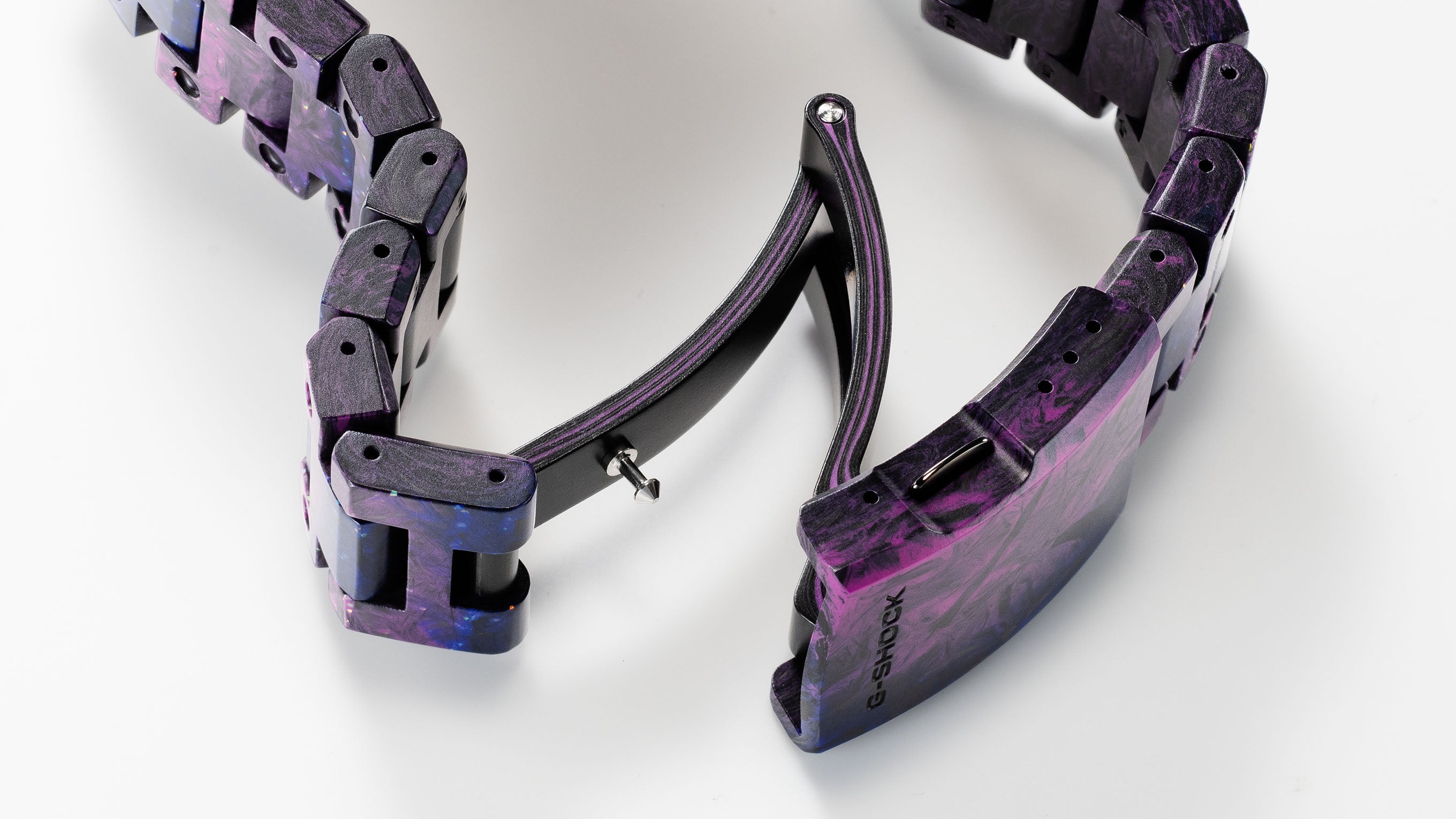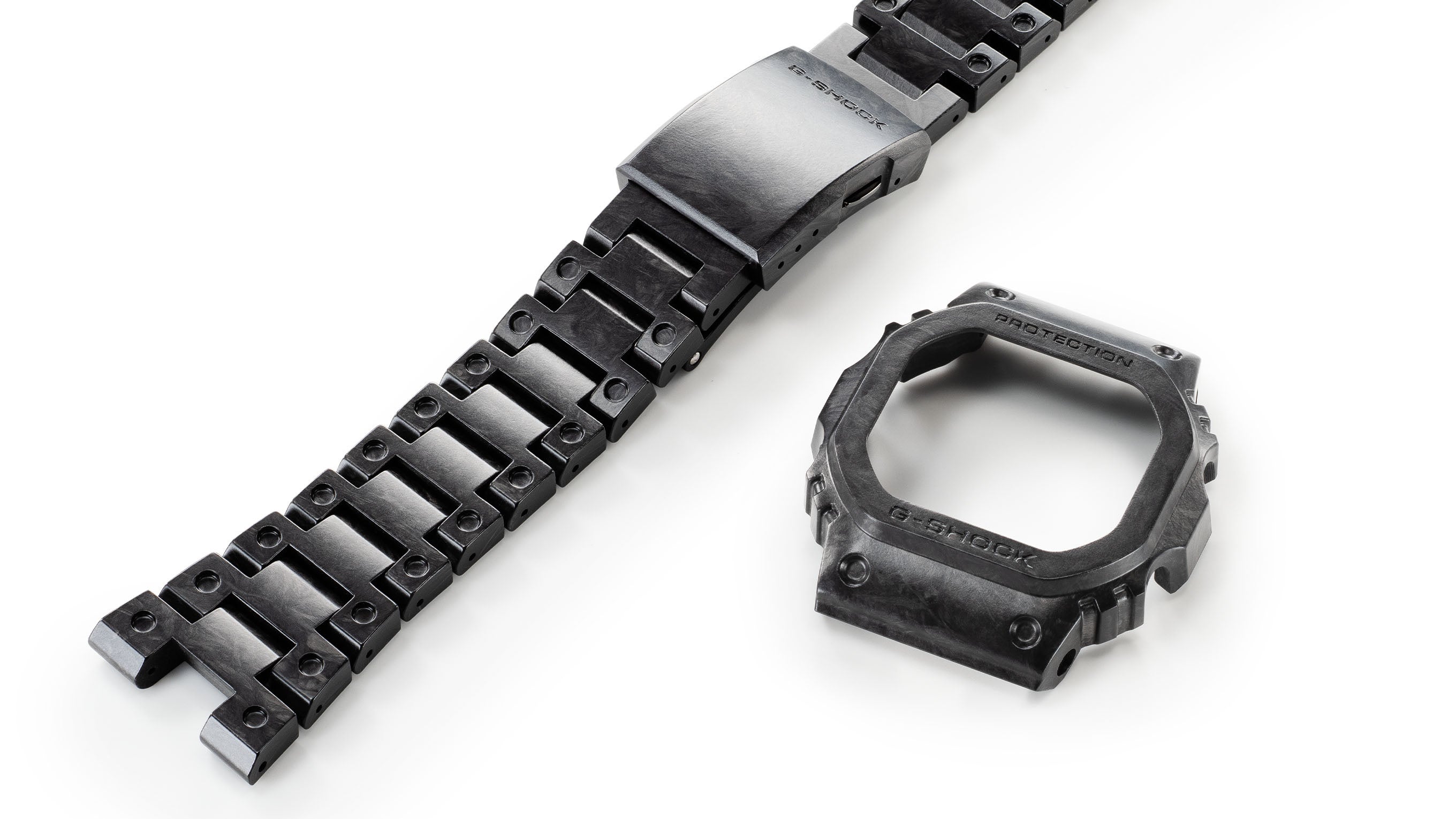 複雑な形状を構成するため、ケース・ベゼル・バンド・中留それぞれに適したカーボンを使い分けることで、ステンレス採用のフルメタルモデル「GMW-B5000D」(約167g)に対し約65gと61%の軽量化※1を実現しました。
