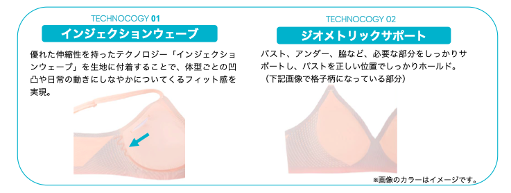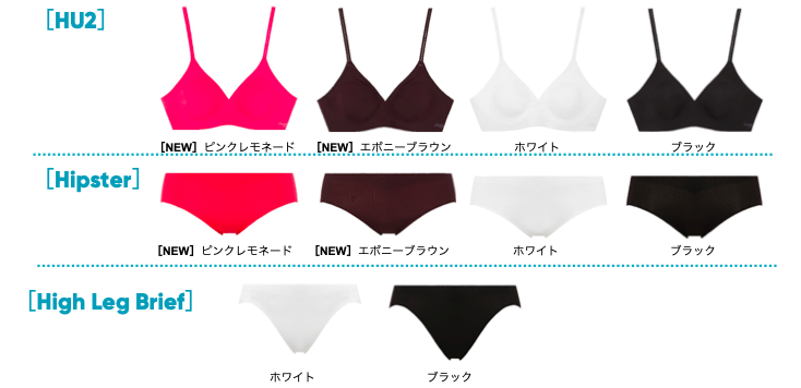 ノンワイヤーブラ [HU2]は、安定感とここちよさの両方を併せ持つ程よいサポート力。コーディネートできる[Hipster]も、ウエスト部分に「ジオメトリックサポート」を搭載しています。
