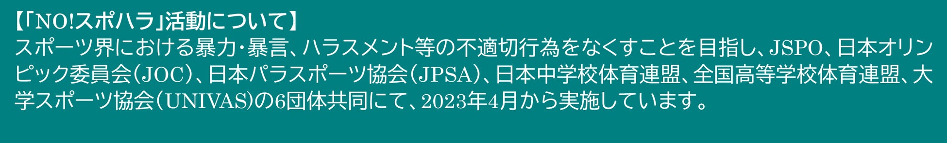 この協力覚書では、本活動の目的である「スポハラをなくし、誰もが安全・安心にスポーツを楽しめる社会を築くこと」を2033年度までに達成するため、2028年度までに調査において「いかなる理由でも指導者・コーチによる不適切な行為があってはならない」と回答する割合を100%とすることを目標に、各種取り組みを行うこととしています。