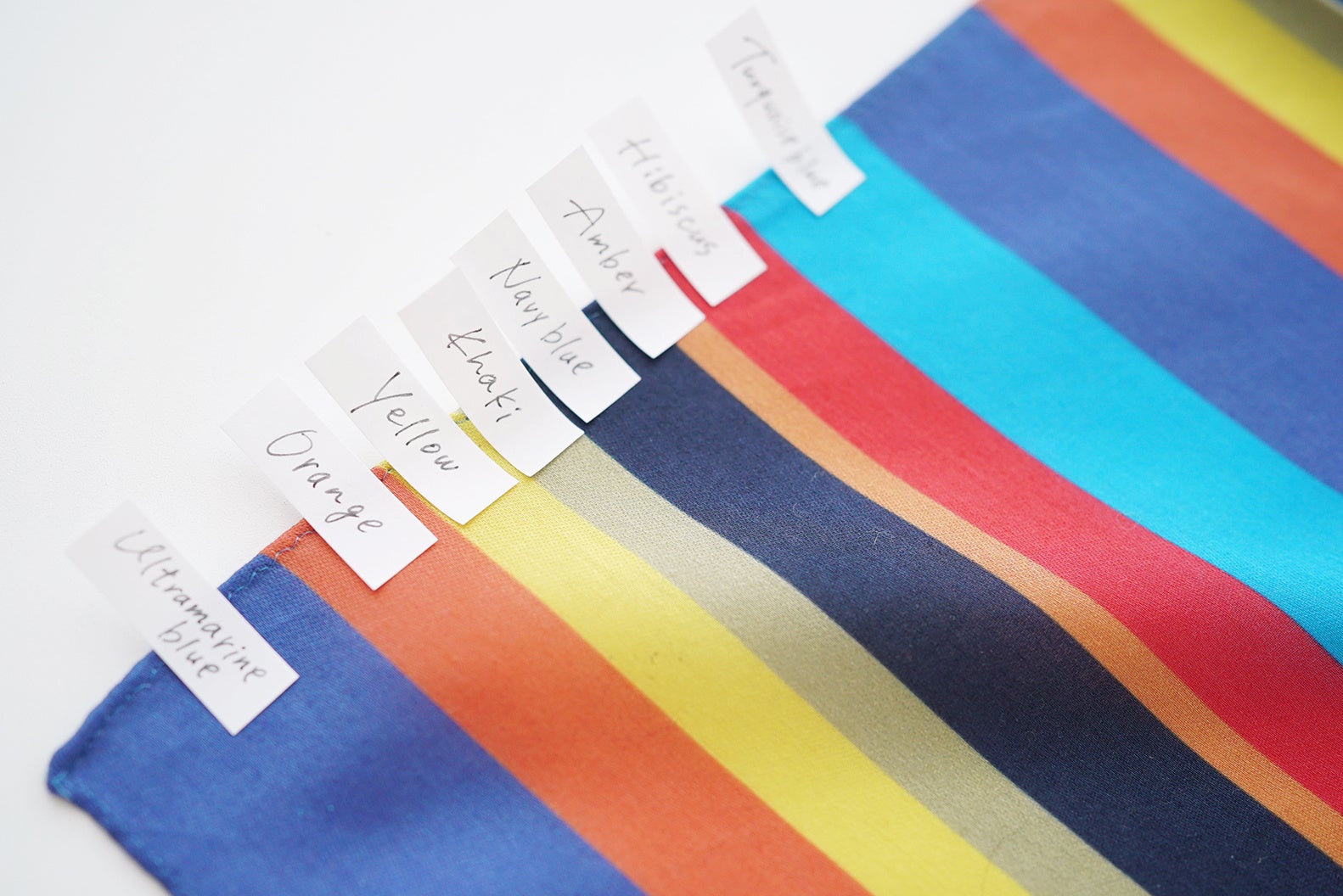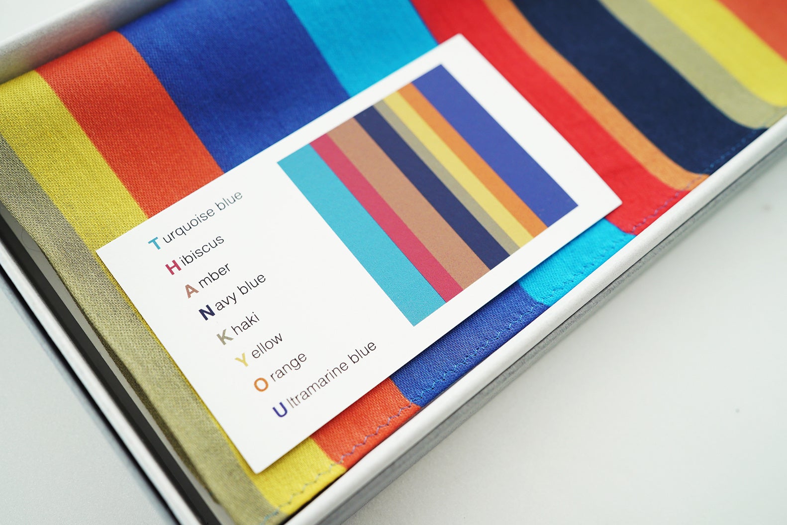 8色のストライプを描き、左から順にT:ターコイズブルー・H:ハイビスカス・A:アンバー・N:ネイビーブルー・K:カーキ・Y:イエロー・O:オレンジ・U:ウルトラマリンブルーの頭文字をつなげると"THANK YOU"のメッセージが隠れています。遊び心のあるユニセックスなデザインです。専用の「THANK YOU」と書かれたカード付きです。