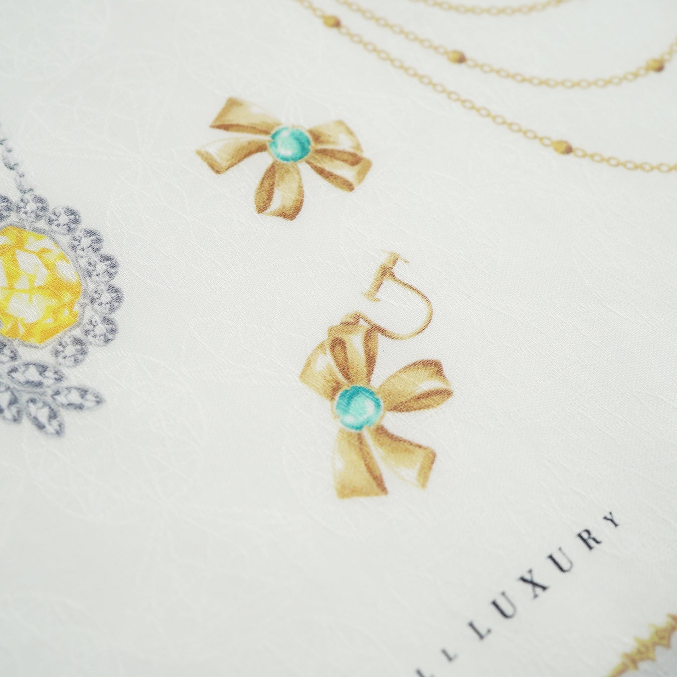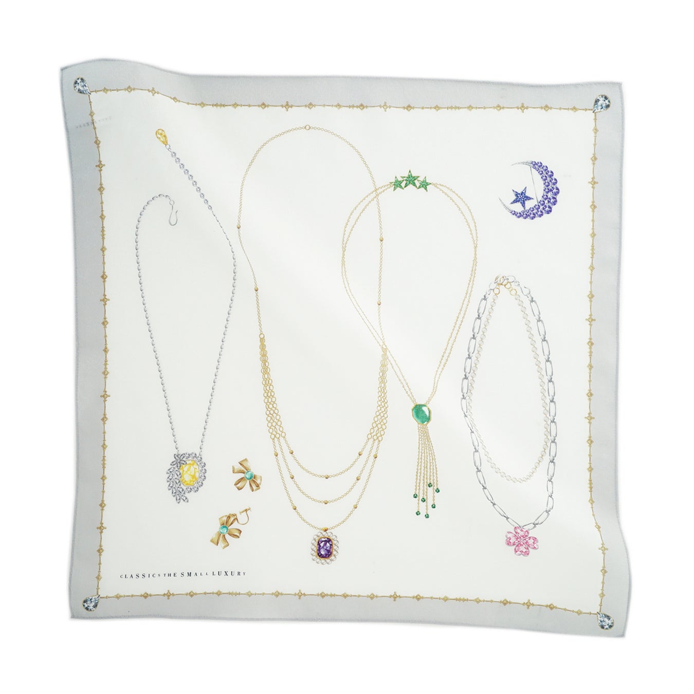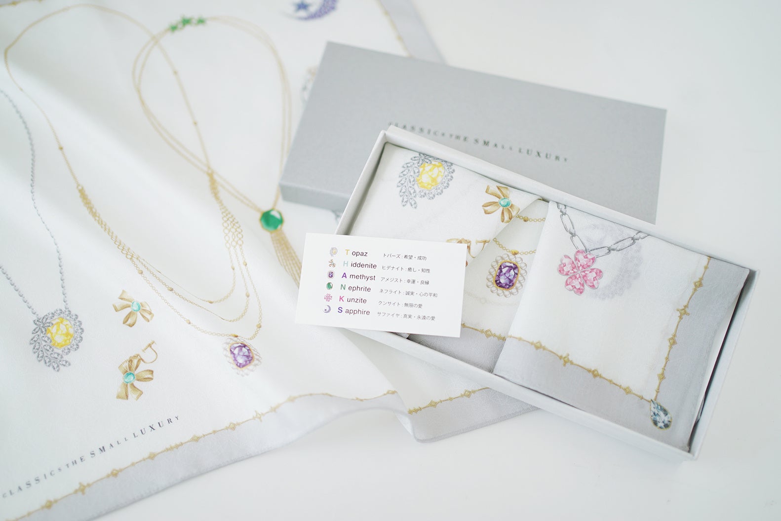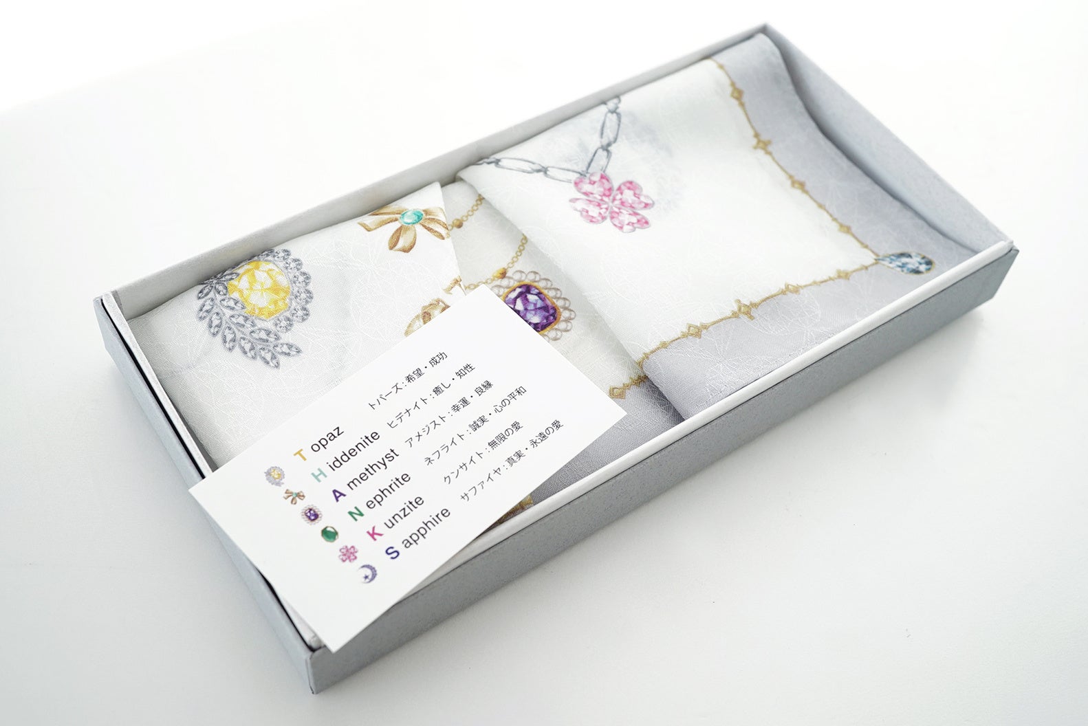 6つの宝石を描き、左から順にT:トパーズ・H:ヒデナイト・A:アメジスト・N:ネフライト・K:クンサイト・S:サファイヤの頭文字をつなげると"THANKS"のメッセージが隠されています。オリジナルデザインのダイヤのジャカード生地を使用し、キラキラと輝くジュエリーモチーフを配した華やかな一枚です。母の日や結婚記念日の贈り物にもおすすめです。専用の「THANKS」と書かれたメッセージカード付き。