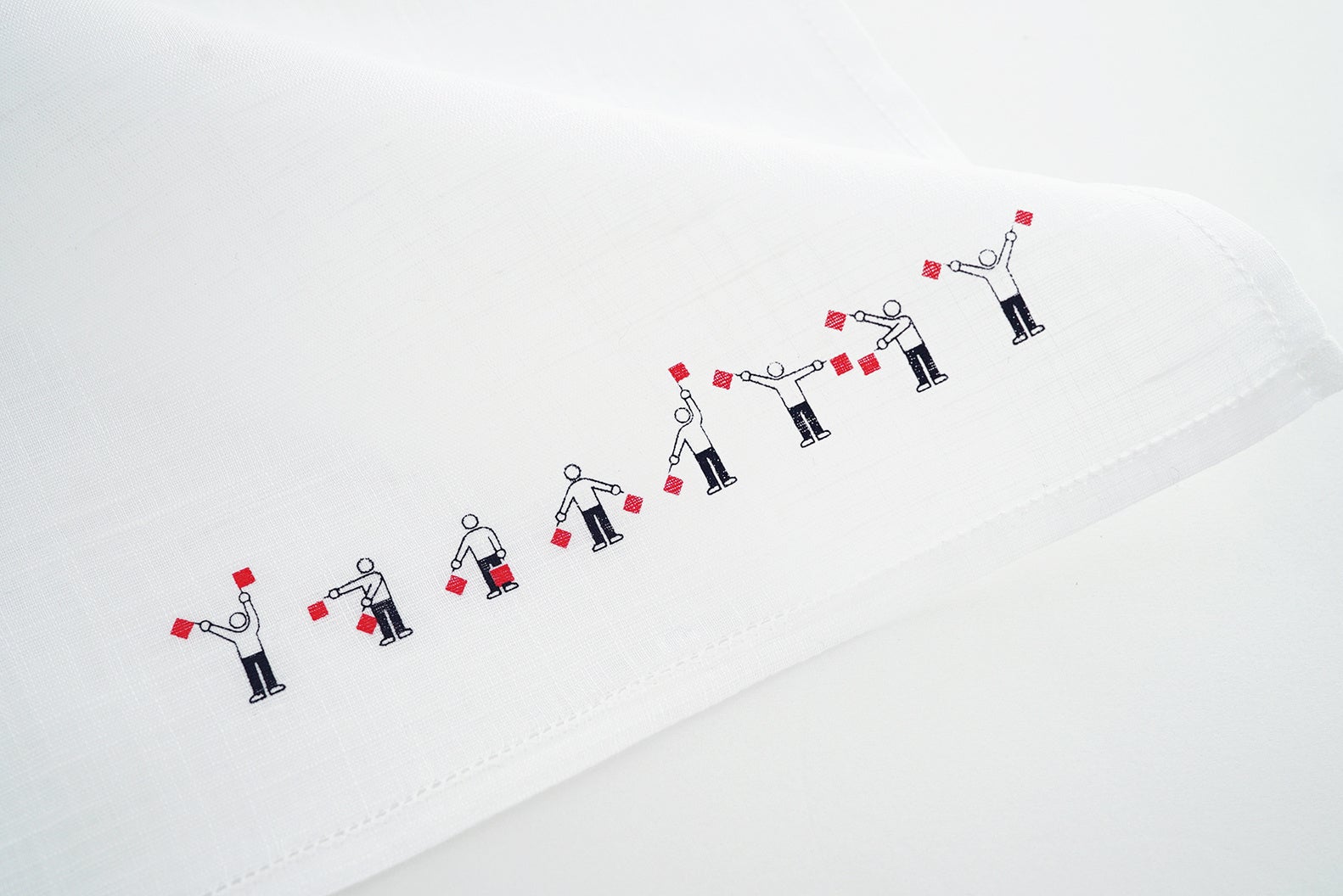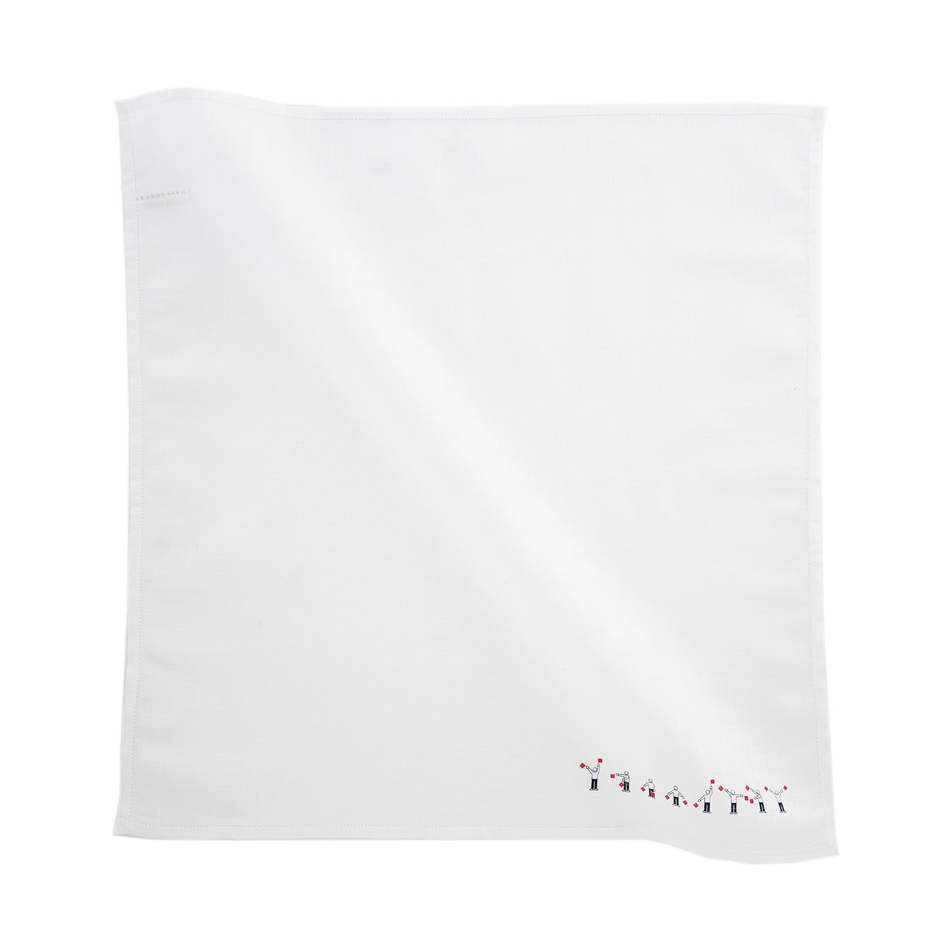 新作のハンカチーフは、贈る相手を思い「ありがとう」のメッセージが込められた3柄を展開します。宝石の頭文字を並びに沿って読んでいくとメッセージになる、ロマンティックな「アクロスティックジュエリー」からインスピレーションを得たものや、手旗信号で表現したデザインなど、密やかに感謝の気持ちを伝えることのできる一枚です。